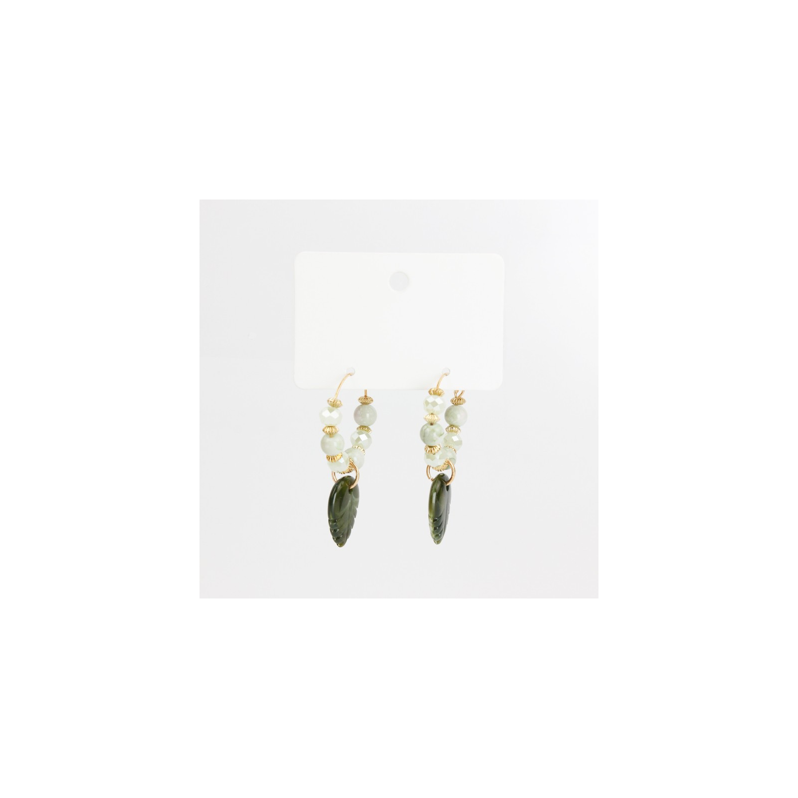 Aro trendy de argolla con bolitas de vidrio, rocas de cristal, piezas de CCB pasantes y dije de acrilico en forma de hoja.