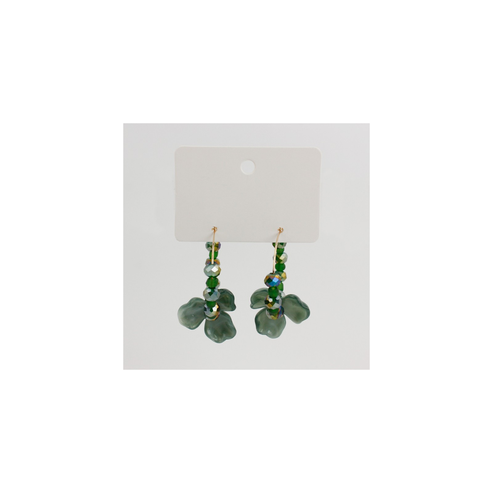 Aro de argolla exclusiva enhebrada con bolitas de vidrio diferenciadas combinado con mostacillas y piezas de acrílicos con forma de flor.
