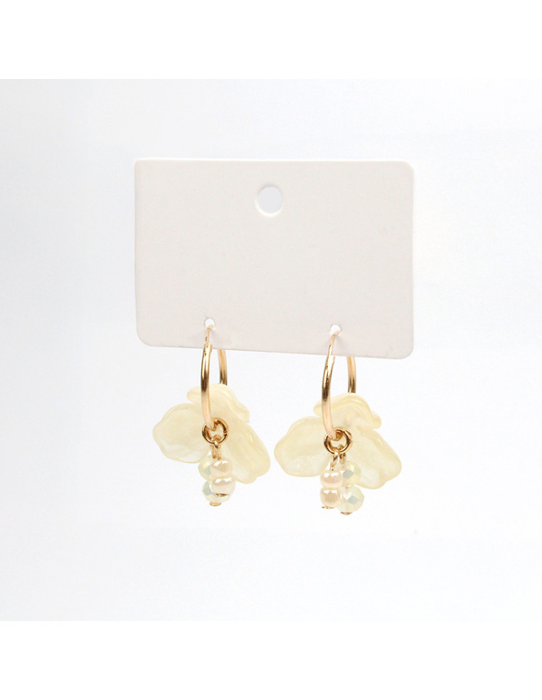 Aro de argolla con piezas de acrílico con forma de flor, rocas de cristal y mostacillas.