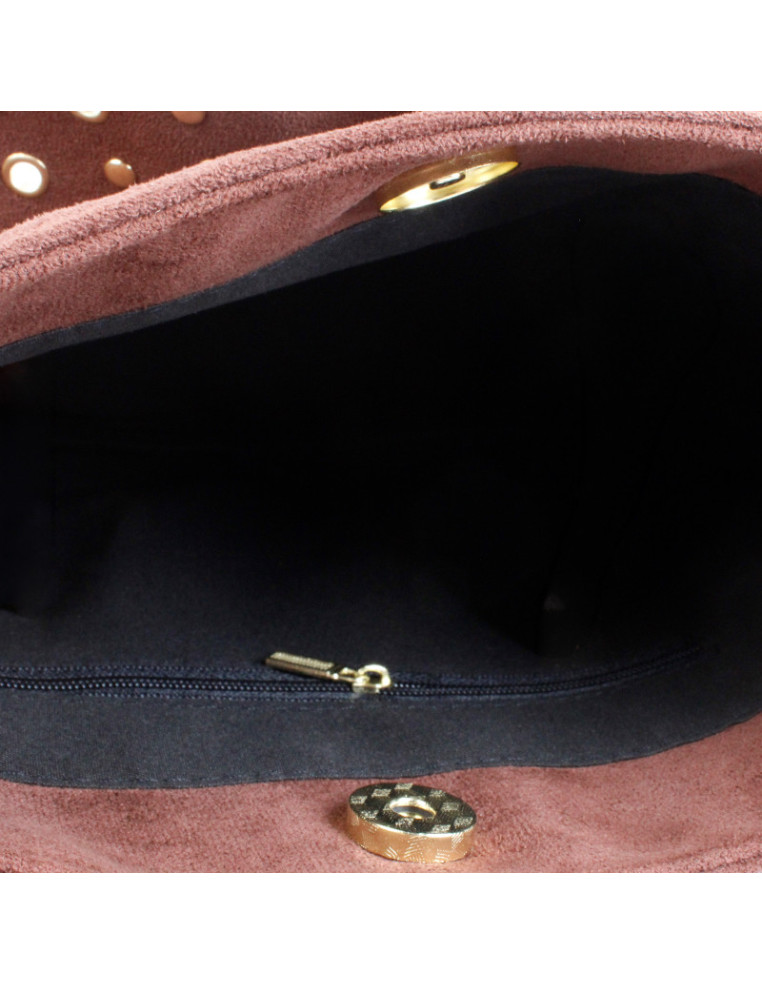 Cartera de gamuza de excelente calidad, intervenida con tachas y ojales.Bolsillo interno con cierre.Medidas: 41cm x 49CM