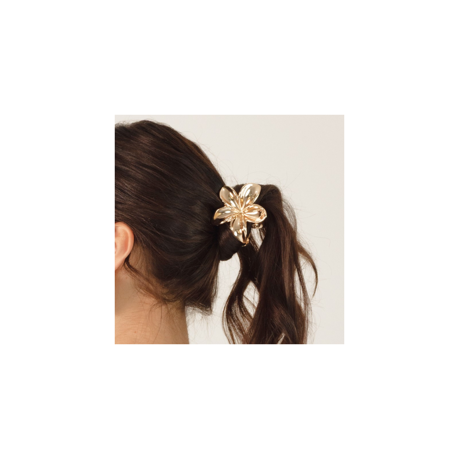 Broche de acrílico para pelo con forma de flor hawaiana dorada.