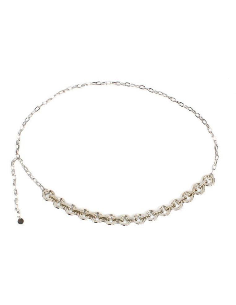 Cinturón de cadenas, con argollas y piezas de CCB. Medidas: 37cm de largo, ajustable con cadena de enganche de 60cm.