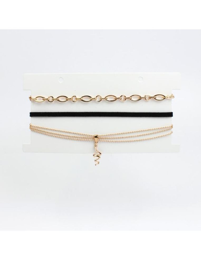 Set de tres chockers de cadena diferenciada y gamuza con múltiples dijes exclusivos dorados.