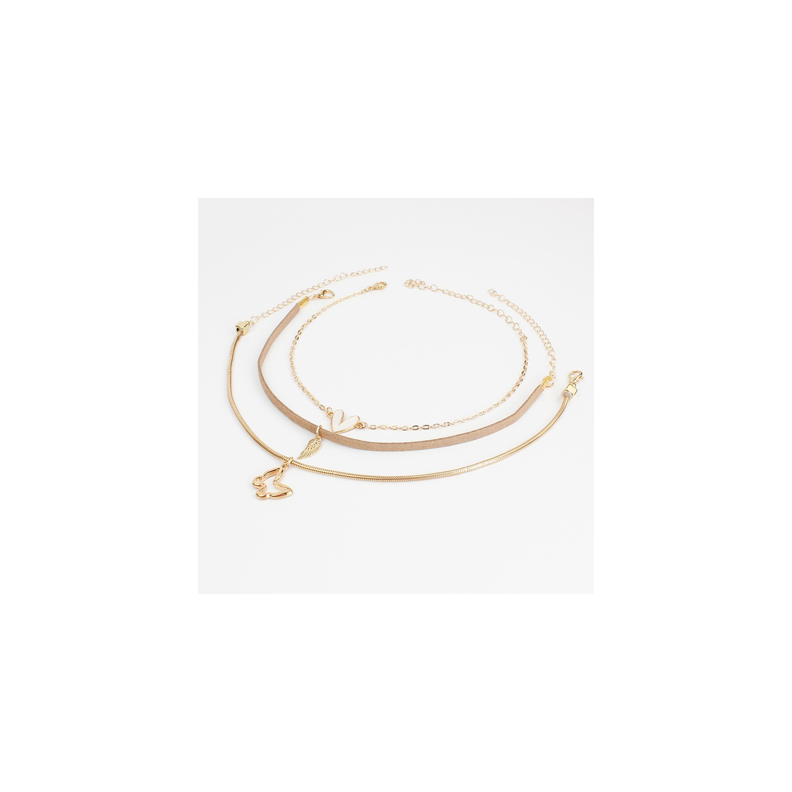 Set de tres chokers de cadenas diferencias  y gamuza con dijes exclusivos dorados e intervenidos con acrílico.