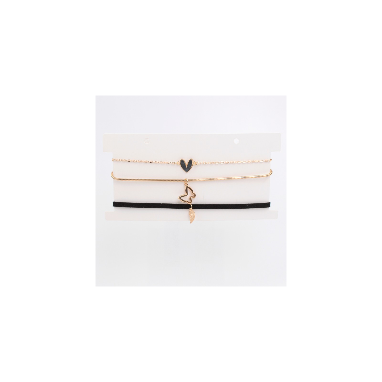 Set de tres chokers de cadenas diferencias y gamuza con dijes exclusivos dorados e intervenidos con acrílico.