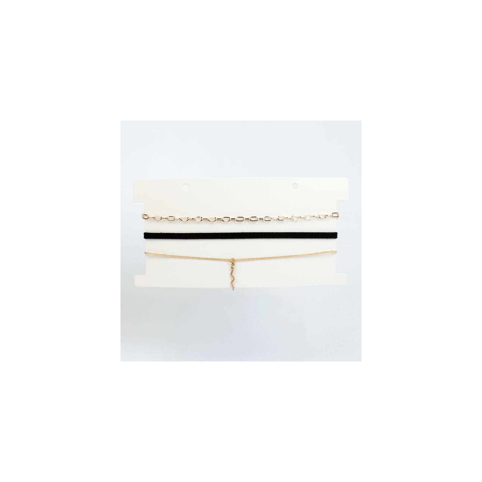 Set de tres chokers, dos de cadenas diferenciadas, con dije exclusivo de fundición con forma de serpiente y uno de gamuza.