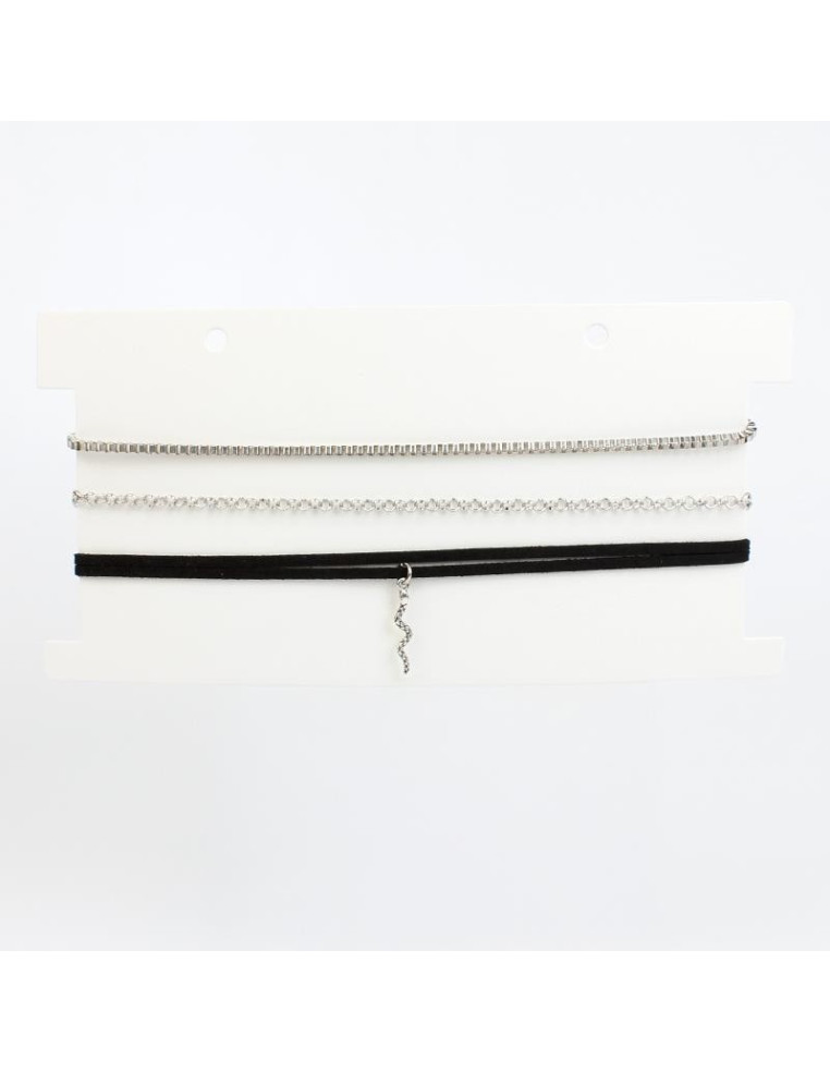 Set de tres chokers, dos de cadenas diferenciadas y uno de gamuza, con dije exclusivo de fundición con forma de serpiente.