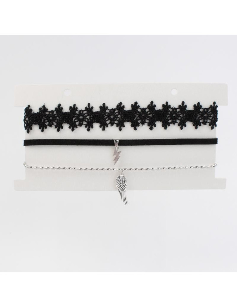 Set de tres choker de cadena, gamuza y tela de encaje con dijes exclusivos níquel.