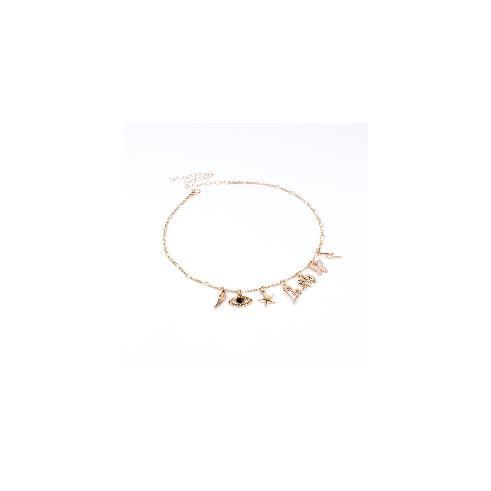 Collar corto de cadena diferenciada y múltiples charms exclusivos y dijes pintados a mano dorados.