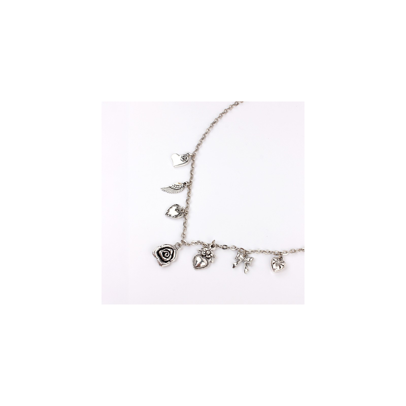 Collar corto de cadena diferenciada con múltiples charms exclusivos de distintas formas y tamaños níquel.