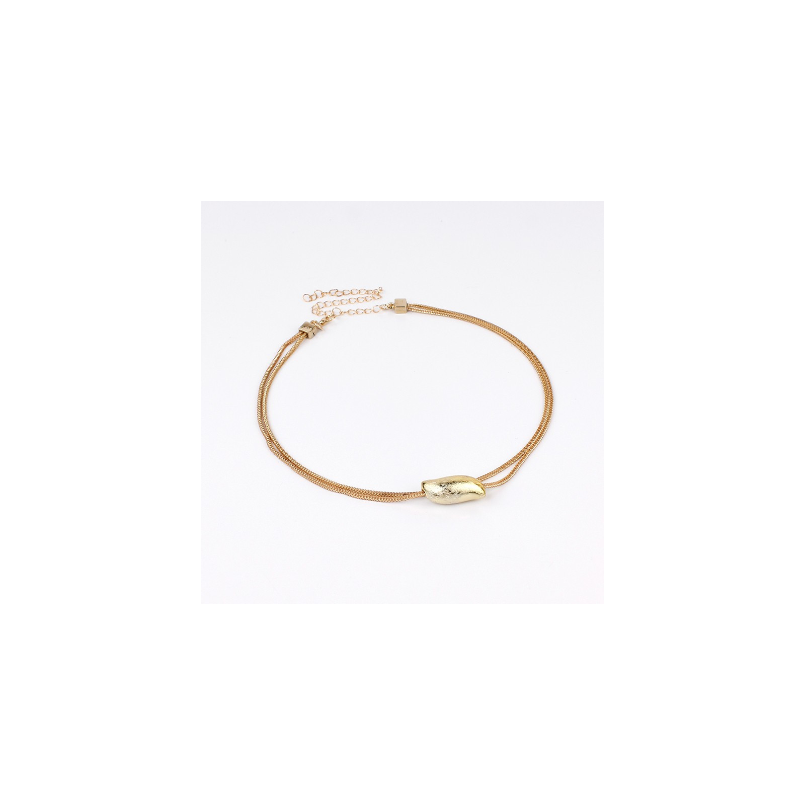 Collar corto de doble caída de cadena diferenciada con pieza pasante exclusiva de ccb dorada texturizada.