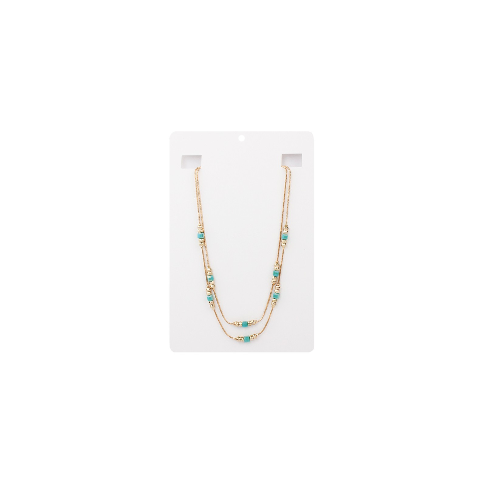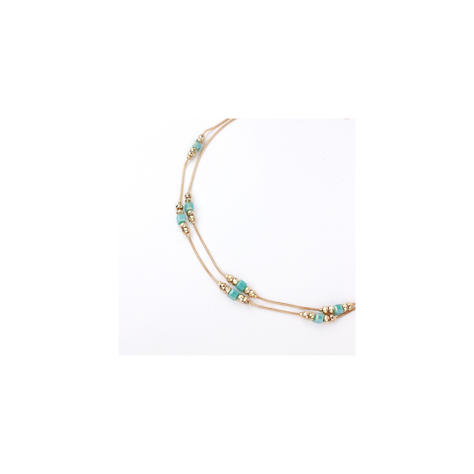 Collar corto de doble caída de cadenas diferenciadas intervenidas con piezas pasantes de ccb dorado y roca de cristal cuadrada.