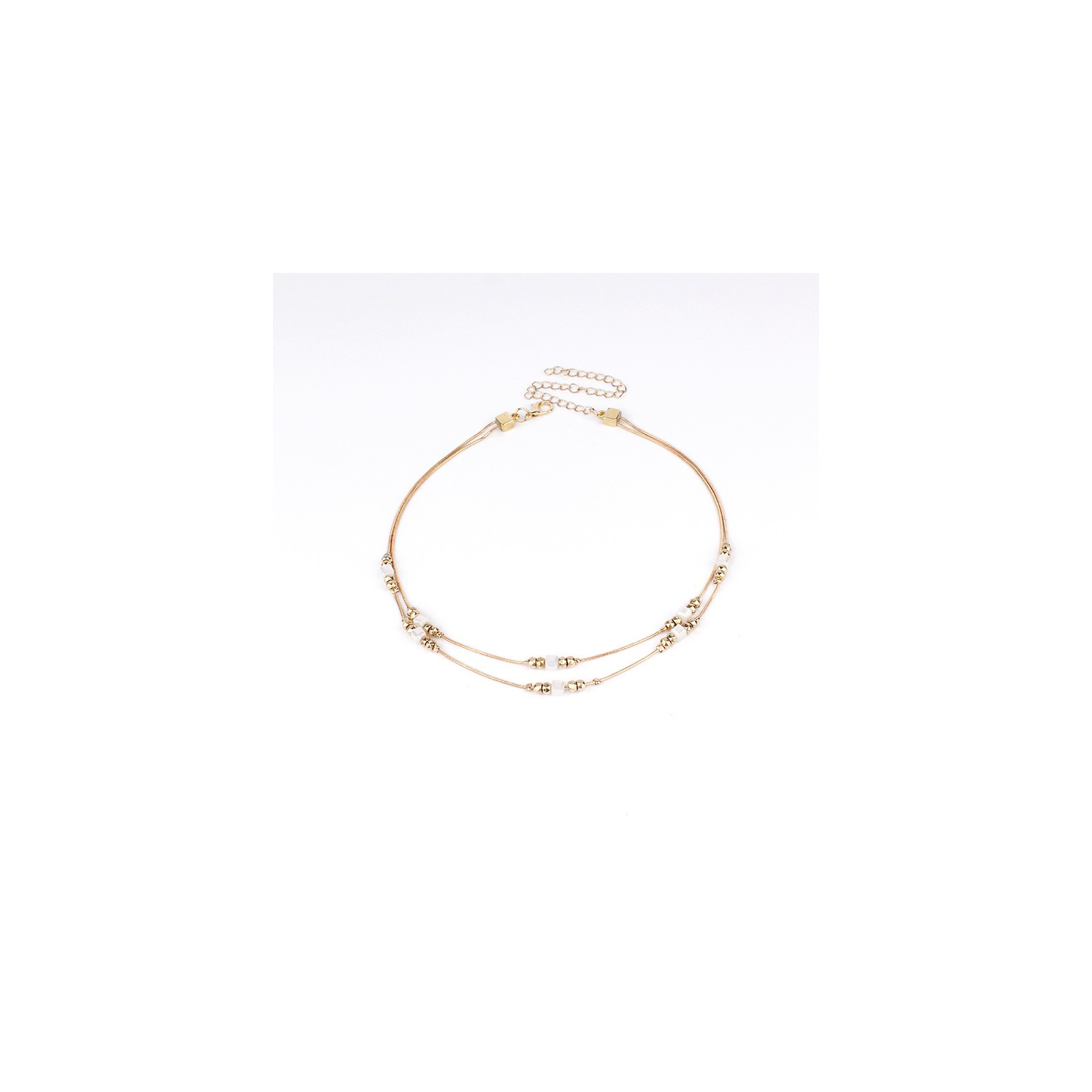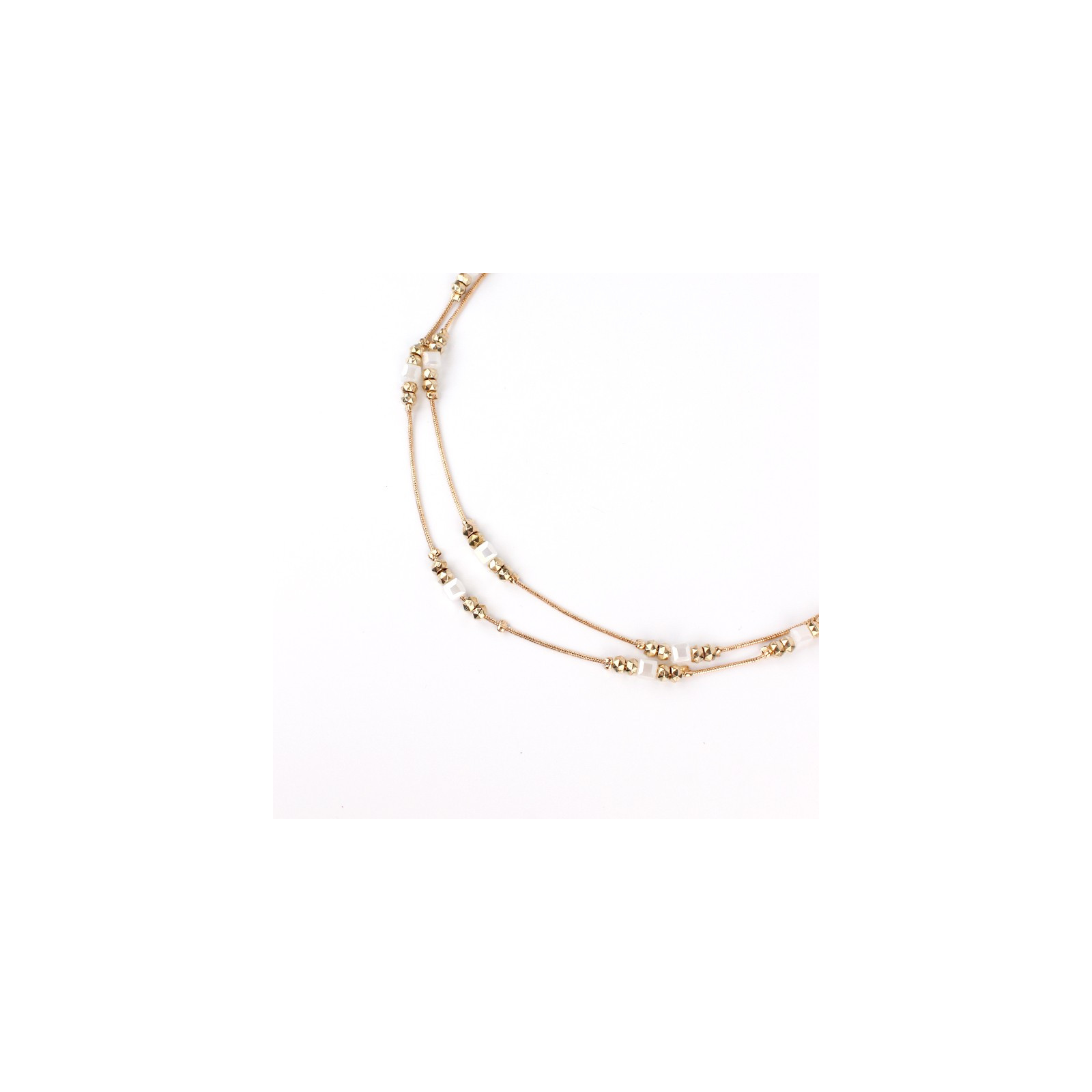 Collar corto de doble caída de cadenas diferenciadas intervenidas con piezas pasantes de ccb dorado y roca de cristal cuadrada.