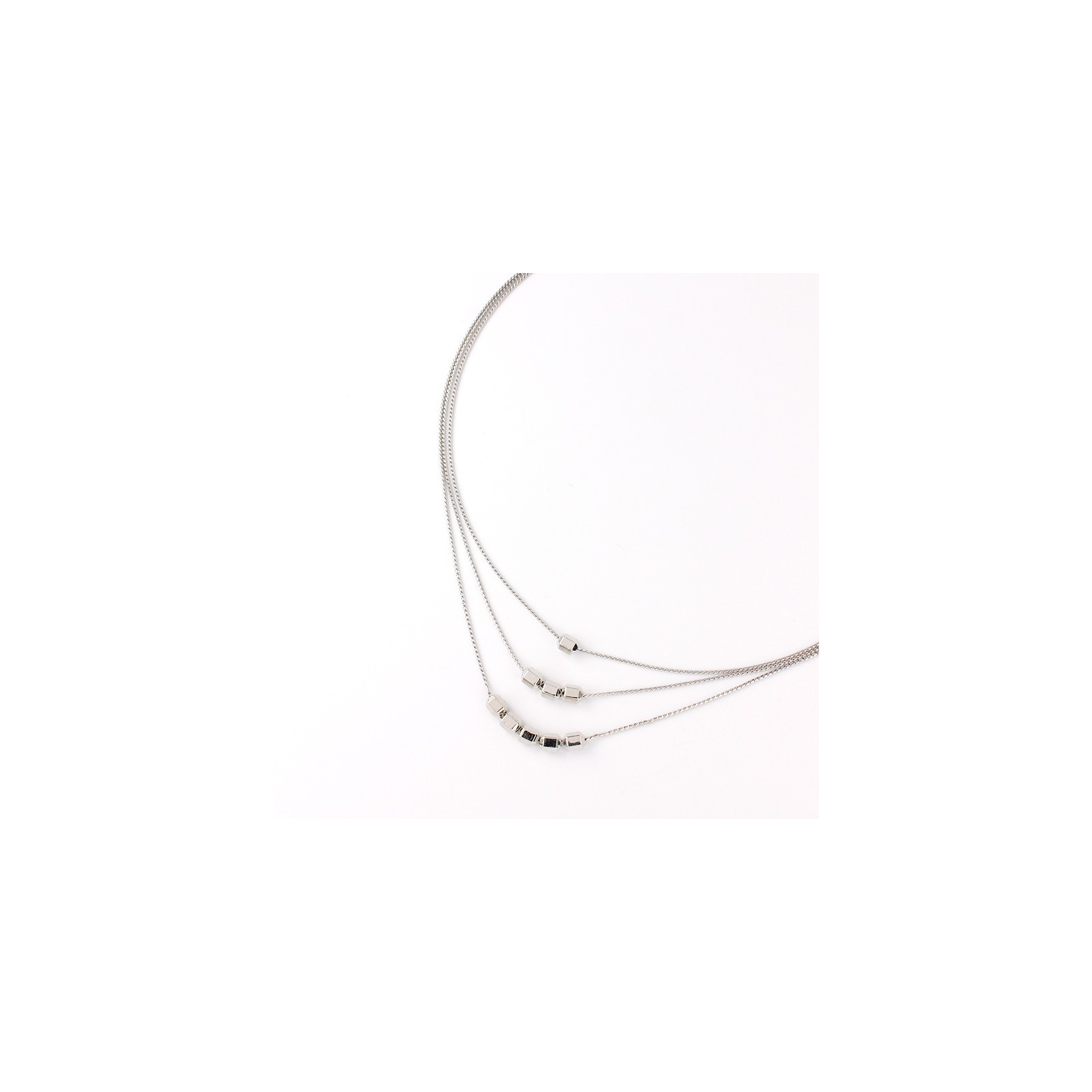 Collar de triple caída de cadenas diferenciadas intervenidas con piezas pasantes de CCB cúbicas níquel.