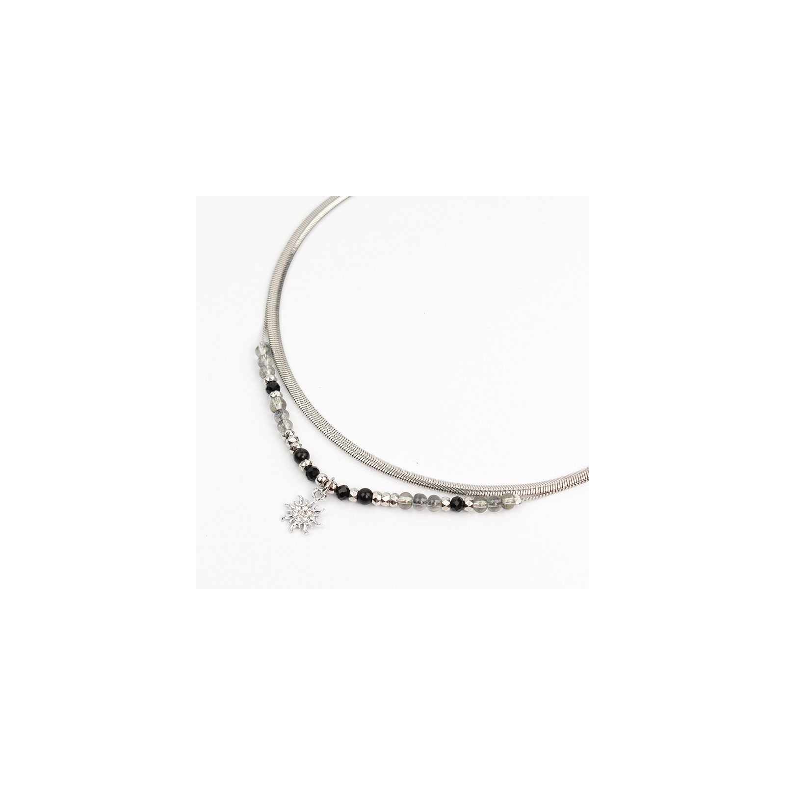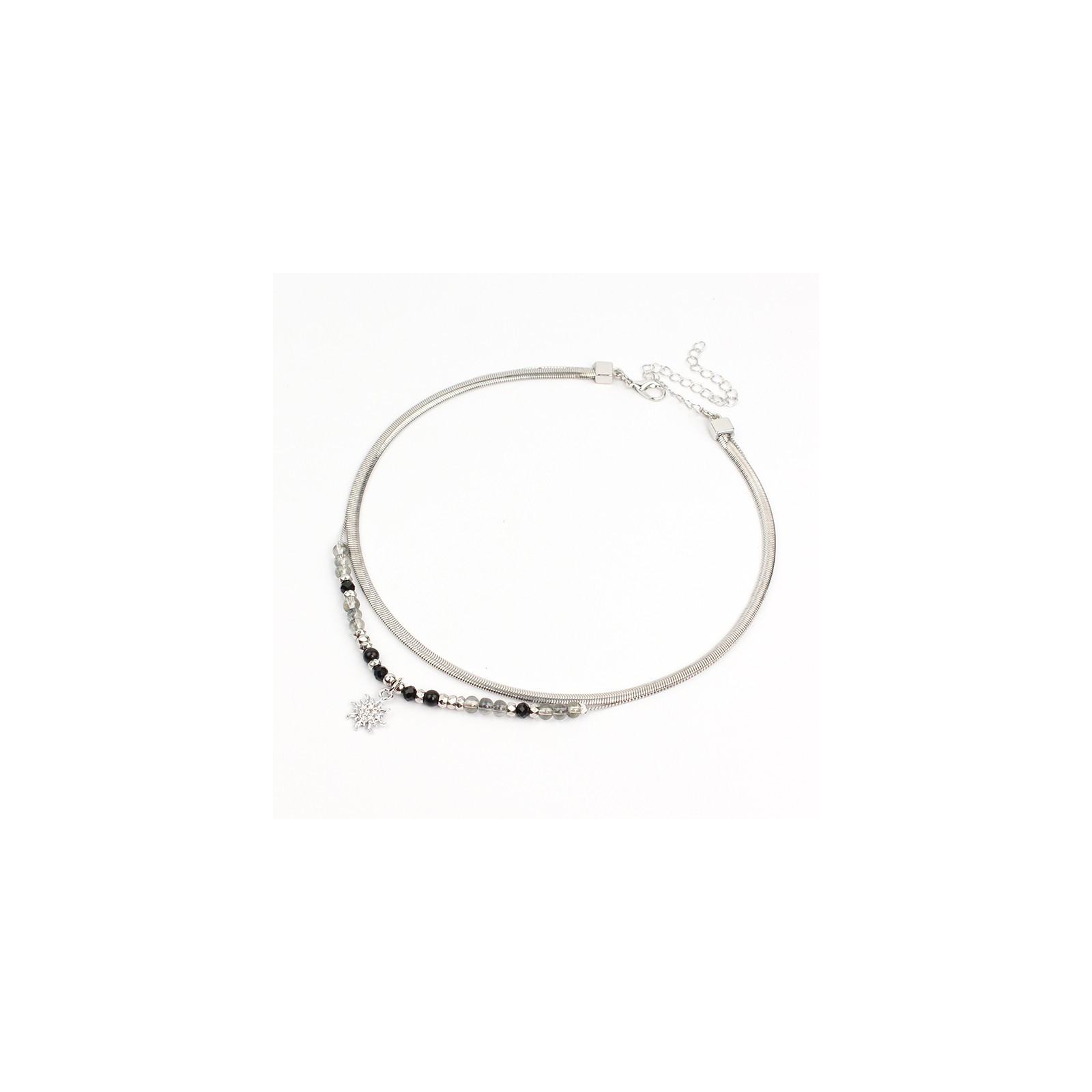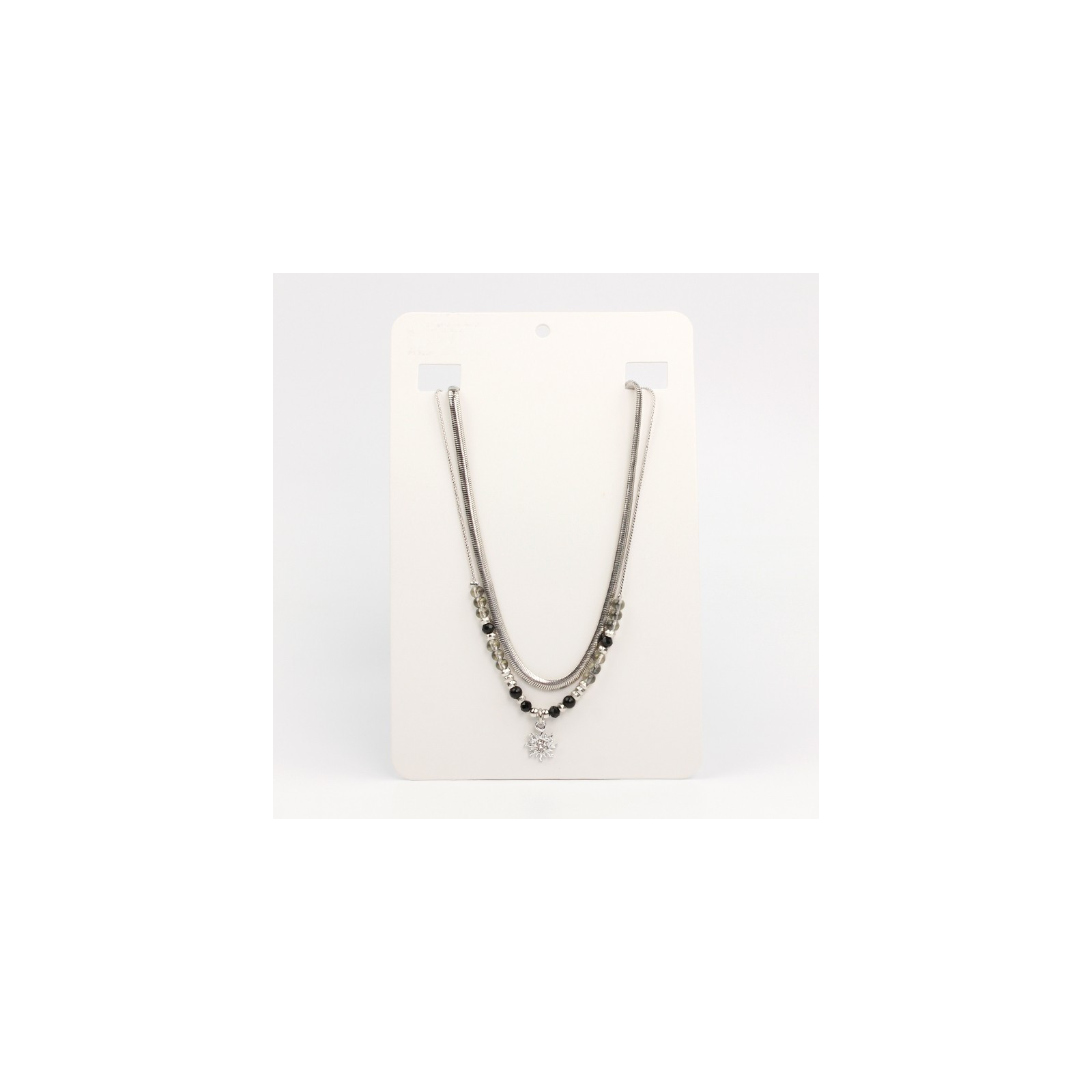 Collar de doble caída de cadenas diferenciadas, una de ellas intervenidas con bolitas de vidrio exclusivas combinadas con roca de cristal, piezas pasantes de CCB y dije de strass con forma de sol.