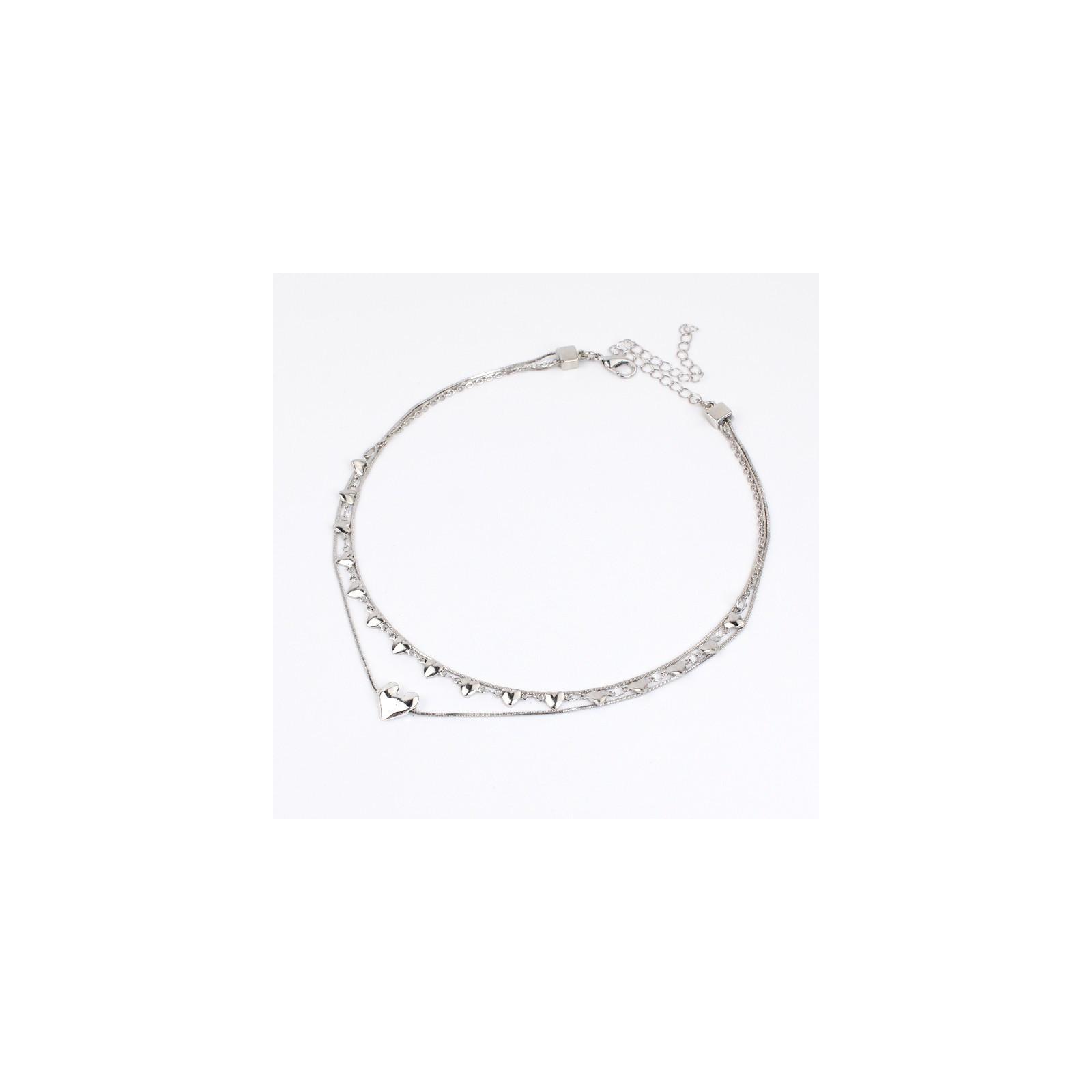 Collar de triple caída de cadenas diferenciadas, una de ellas con eslabones de corazón, otra con dije de corazón.