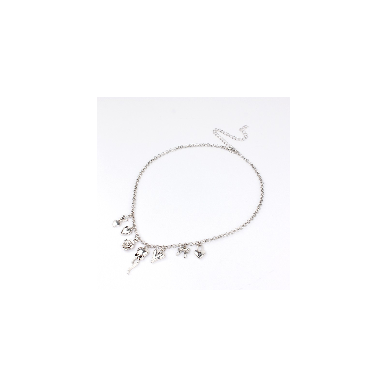 Collar de cadena diferenciada con múltiples dijes exclusivos de diferentes formas y tamaños en níquel.