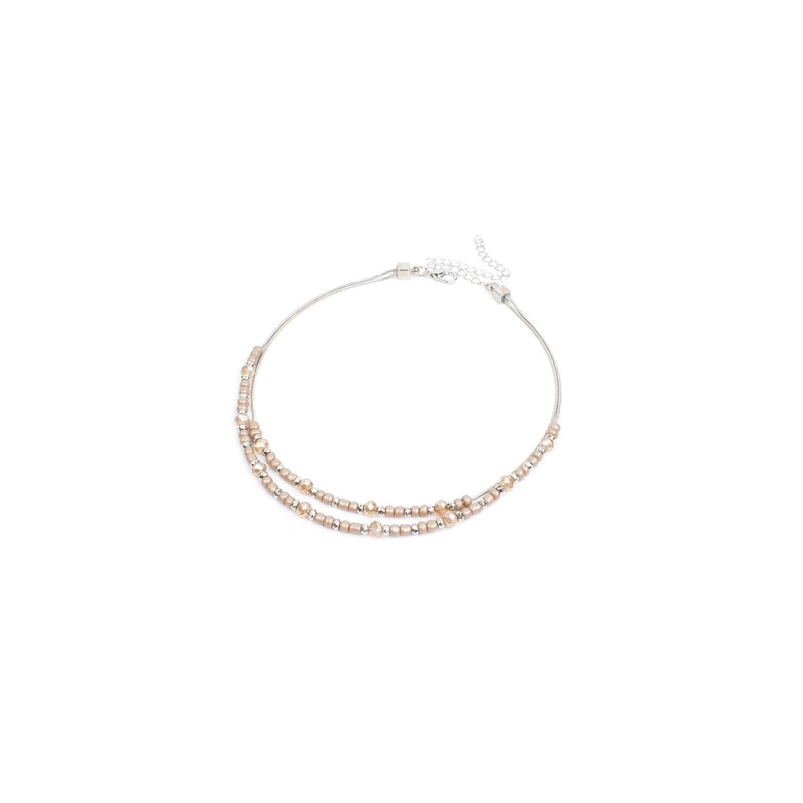 Collar con doble caída de cadenas diferenciadas intervenida con mostacillas combinadas con roca de cristal y piezas de CCB.
