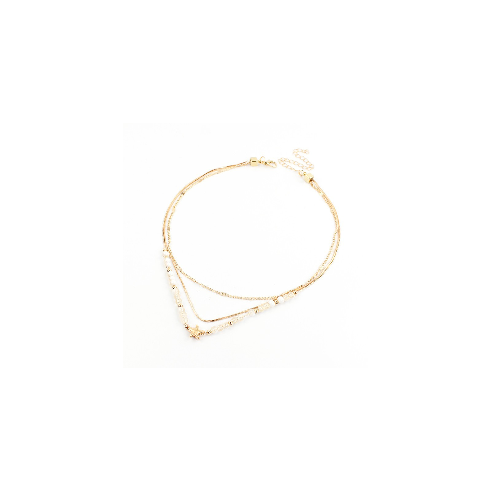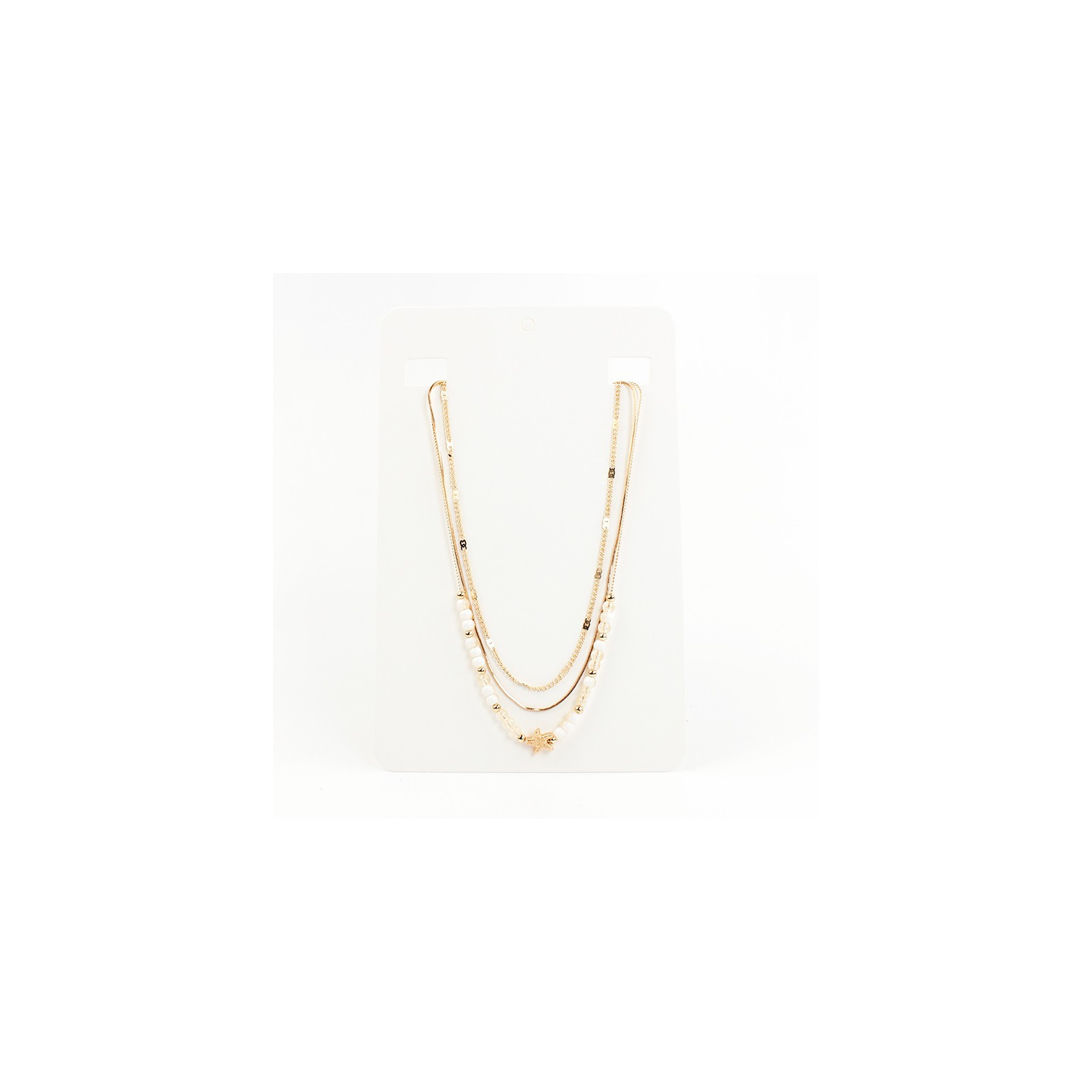 Collar de triple caída de cadenas diferenciadas, una de ellas enhebrada con bolitas de vidrio exclusivas, combinadas con pasantes de CCB y dije exclusivo con forma de estrella de mar.