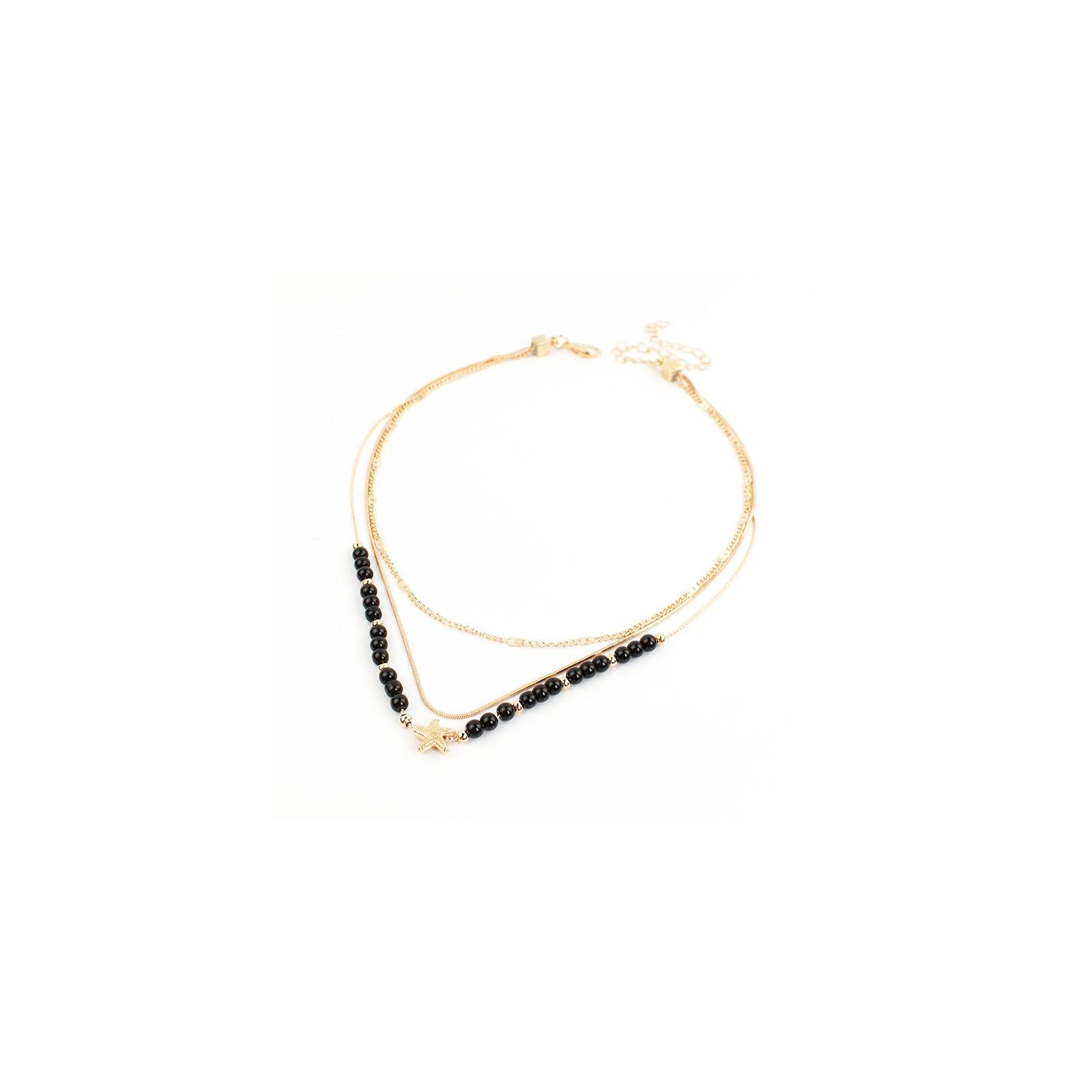 Collar de triple caída de cadenas diferenciadas, una de ellas enhebrada con bolitas de vidrio exclusivas, combinadas con pasantes de CCB y dije exclusivo con forma de estrella de mar.