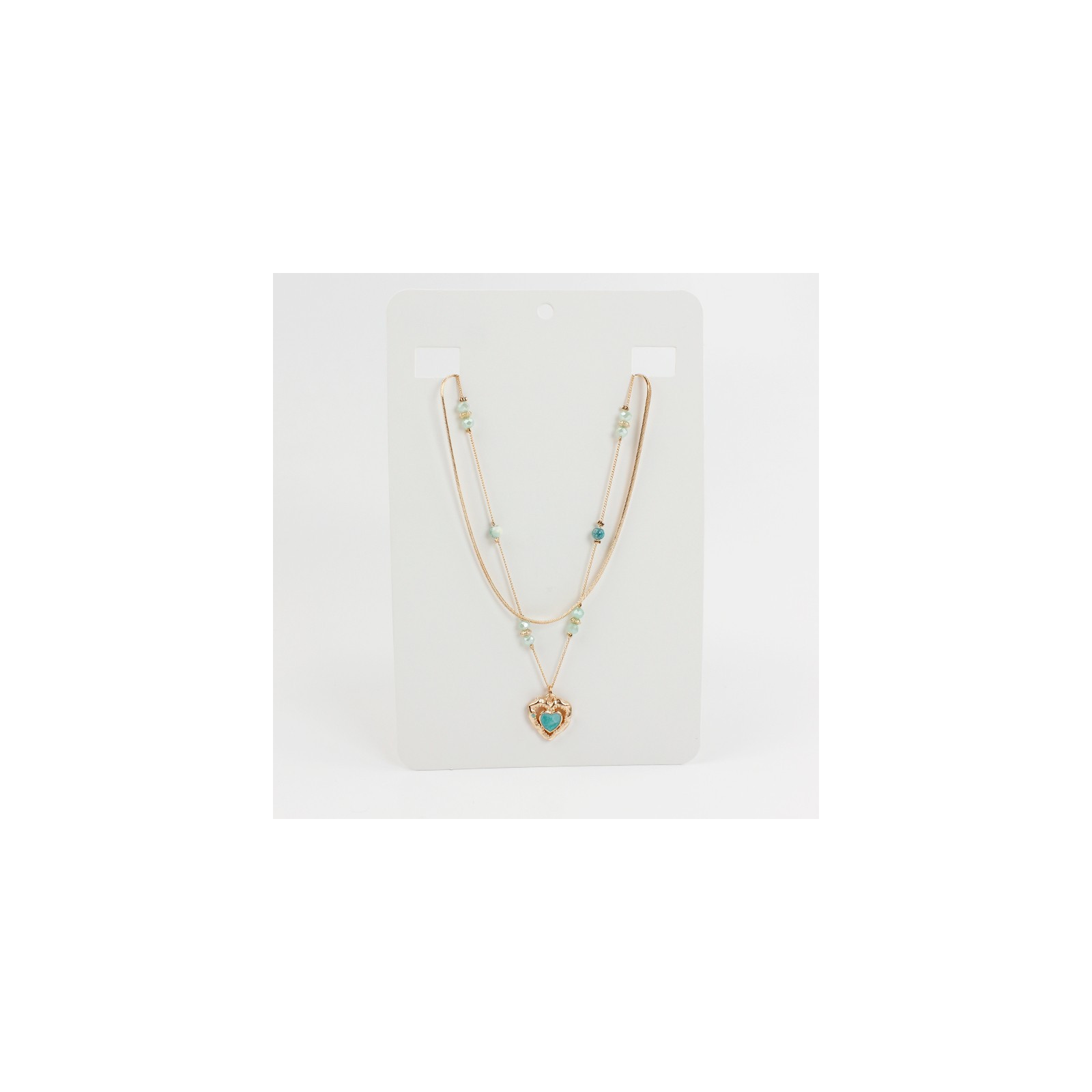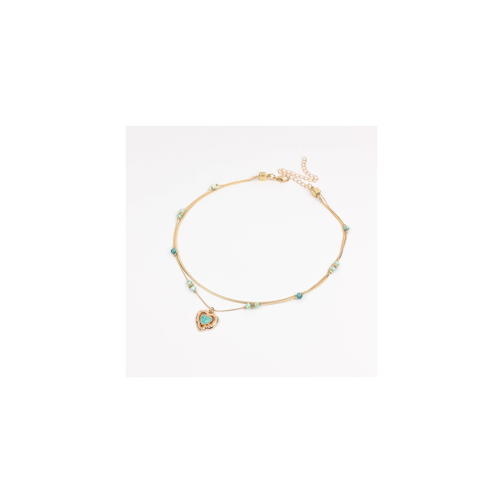Collar de doble caída de cadena diferenciada, una de ellas intervenidas con bolitas de vidrio exclusivas, roca de cristal, piezas pasantes de CCB y dije exclusivo con forma de corazón pintado a mano.