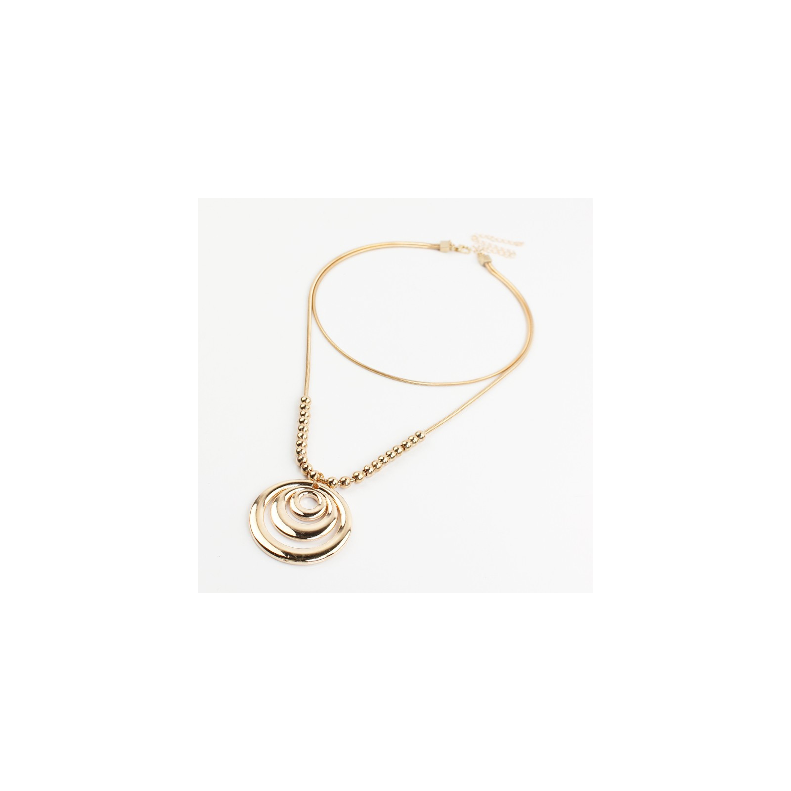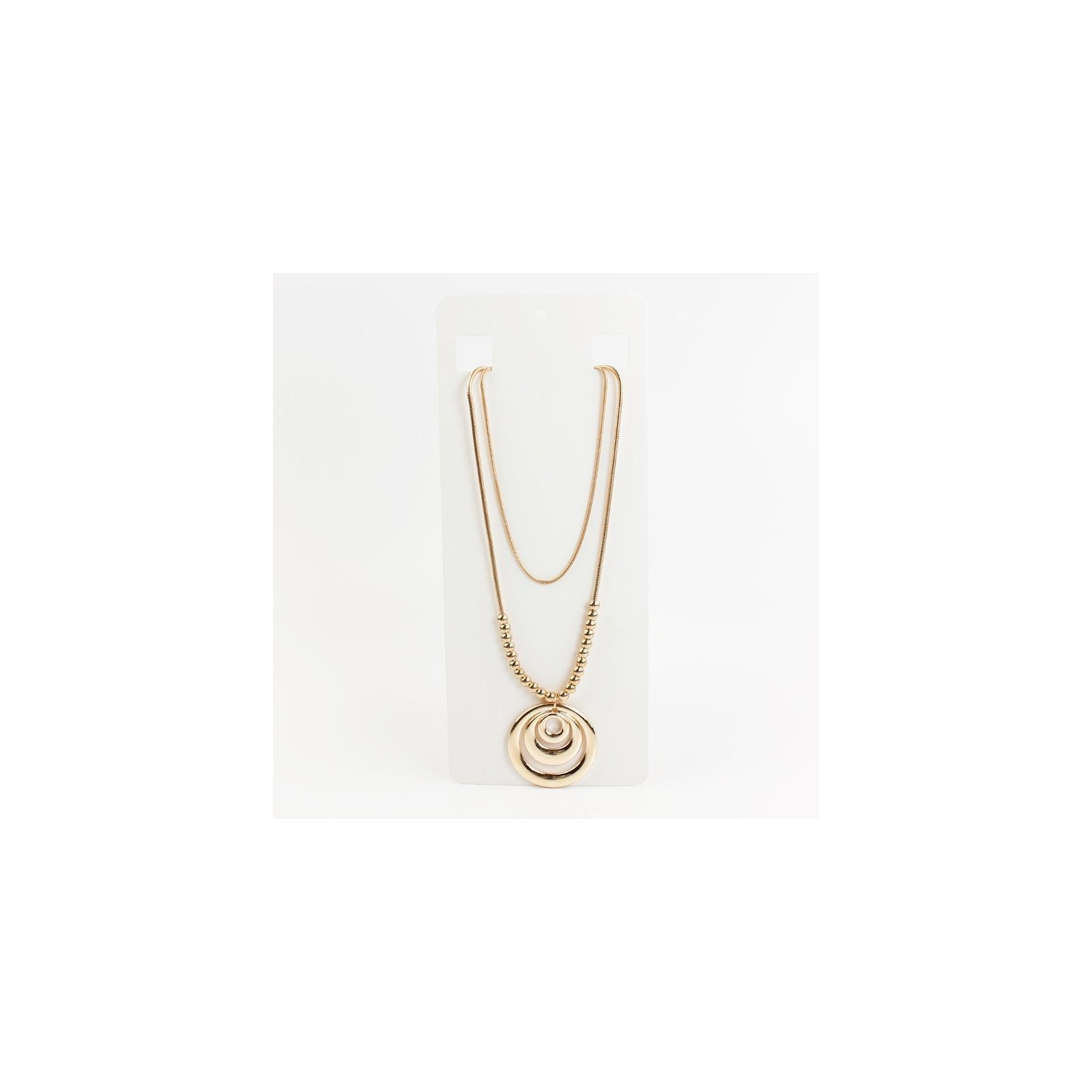 Collar de doble caída de cadenas diferenciadas, una de ellas enhebrada con bolitas pasantes y dije exclusivo de fundición.