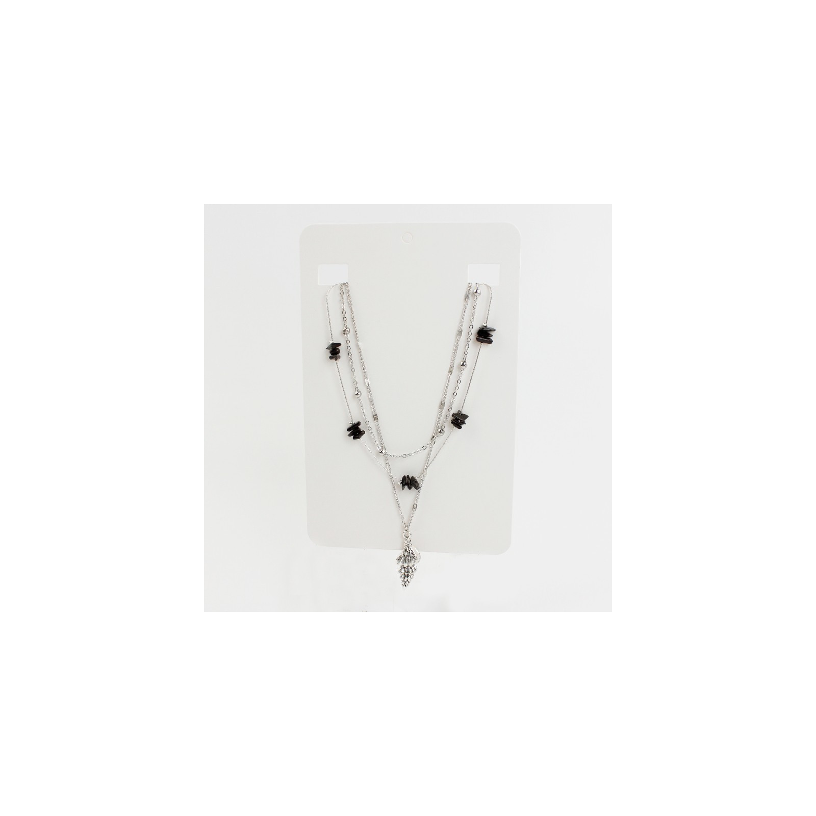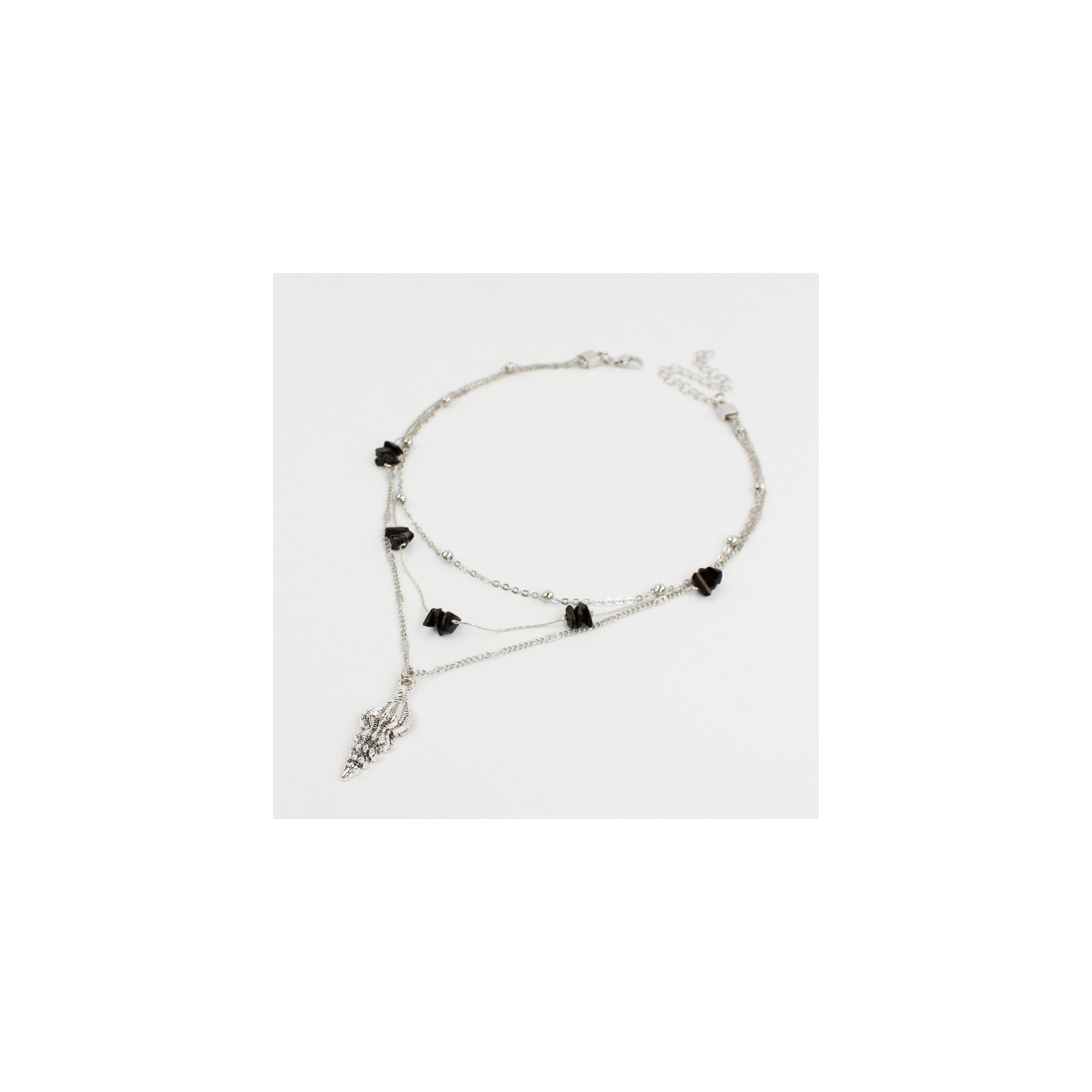 Collar de triple caída de cadenas diferenciadas, una de ellas intervenidas con escallas de acrílico y dije exclusivo de fundición con forma de caracol.