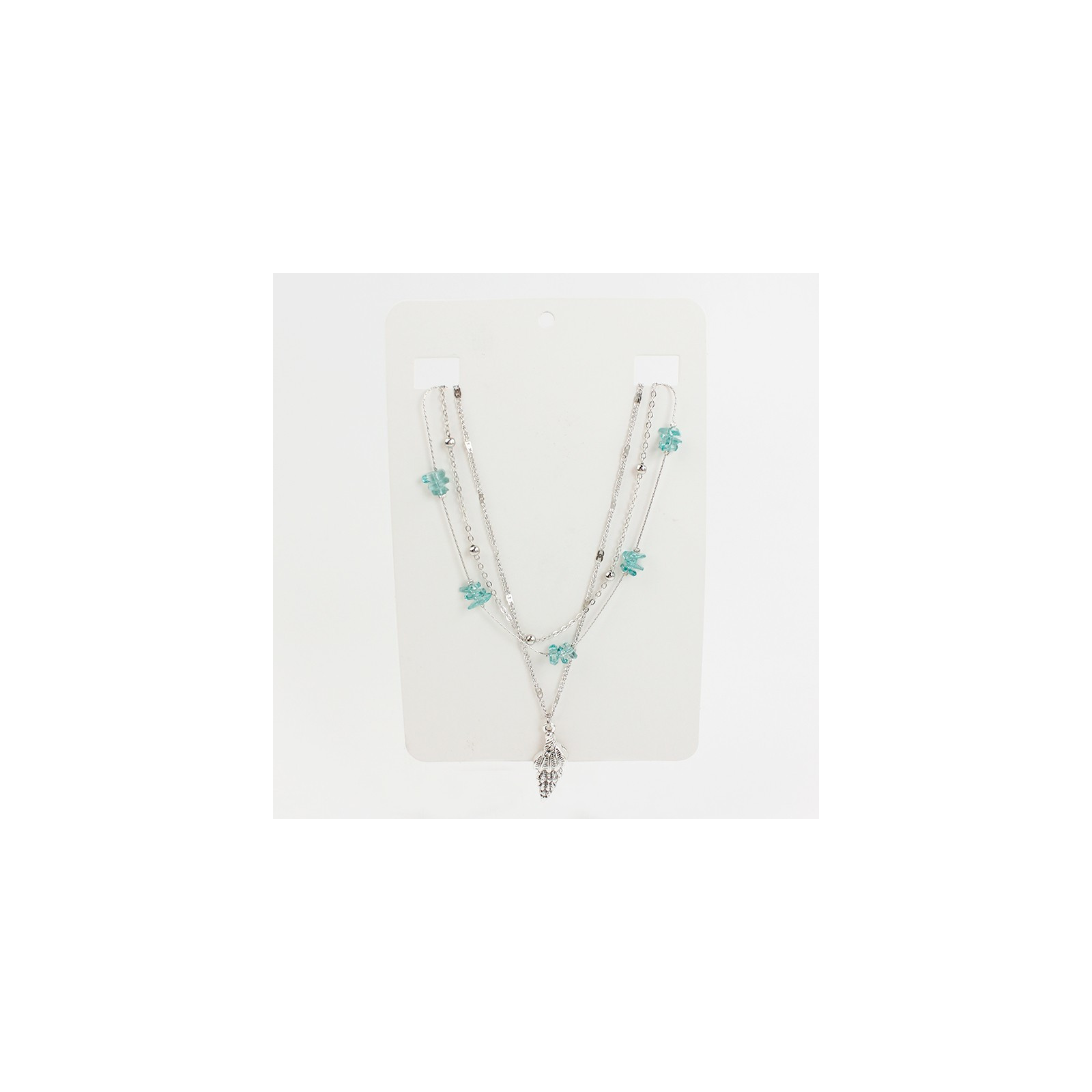 Collar de triple caída de cadenas diferenciadas, una de ellas intervenidas con escallas de acrílico y dije exclusivo de fundición con forma de caracol.