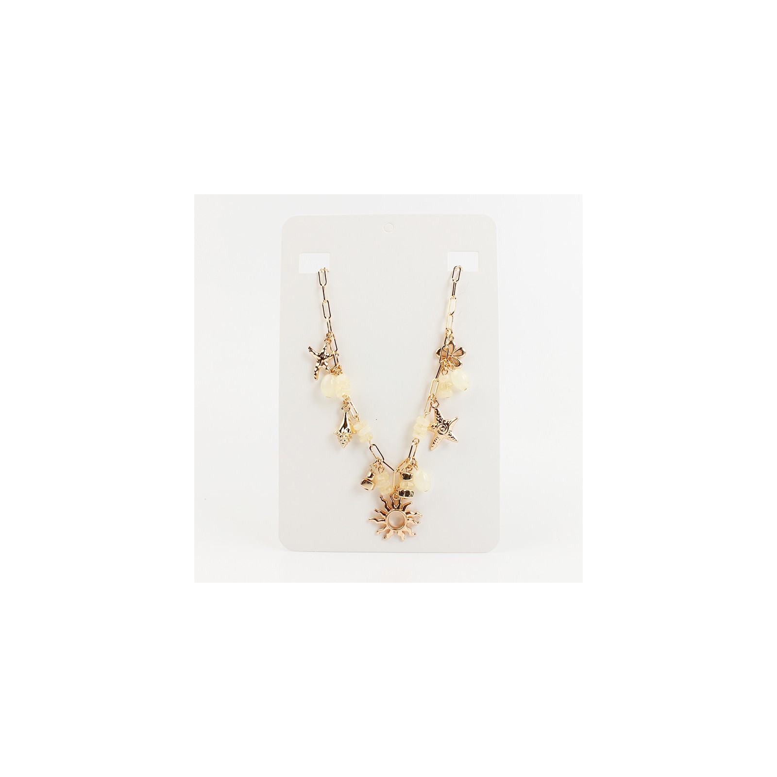 Collar de cadena diferenciada con múltiples dijes exclusivos de fundición, combinados con escallas de acrílico.
