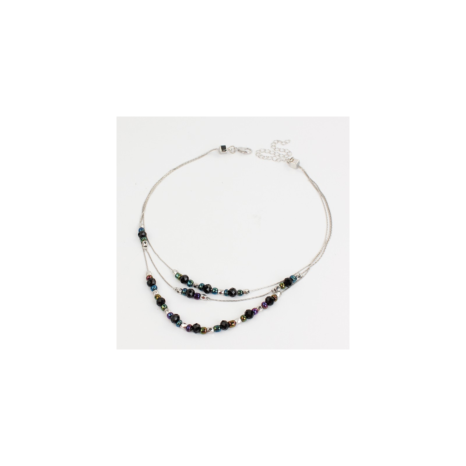 Collar de triple caída de cadenas diferenciadas, intervenidas con roca de cristal, mostacillas y piezas pasantes de CCB.