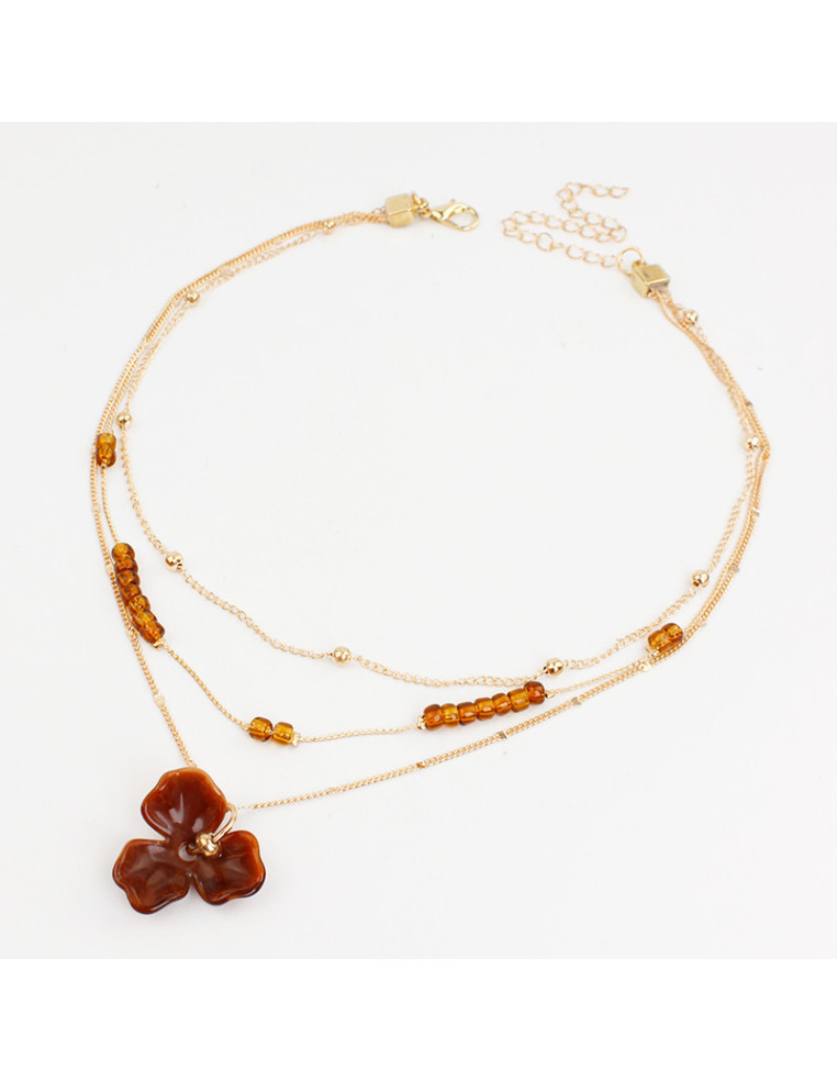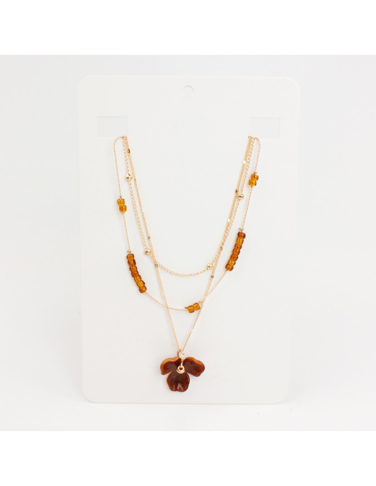 Collar de triple caída de cadenas diferenciadas, una de ellas intervenida con mostacillas y dijes exclusivos de acrílico con forma de flor.