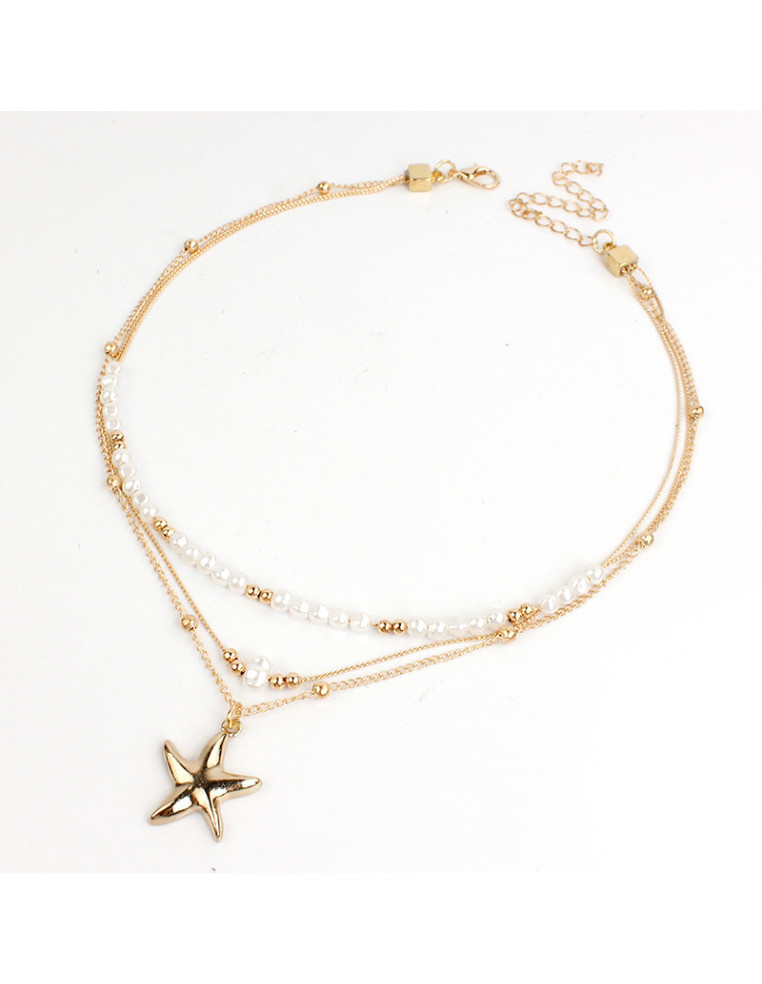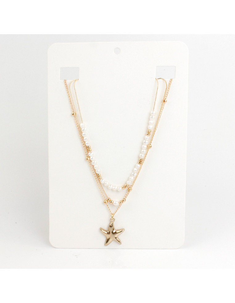 Collar de triple caída de cadenas diferenciadas, una de ellas enhebrada con perlas simil rio y separadores de CCB, otra con dije exclusivo de fundición con forma de estrella de mar.