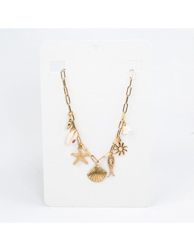 Collar multicharms de cadena diferenciada, con múltiples dijes exclusivos de fundición, buzio natural y escallas de acrílico. Medidas:  36cm de largo y diámetro ajustable con cadena de enganche de 10cm.