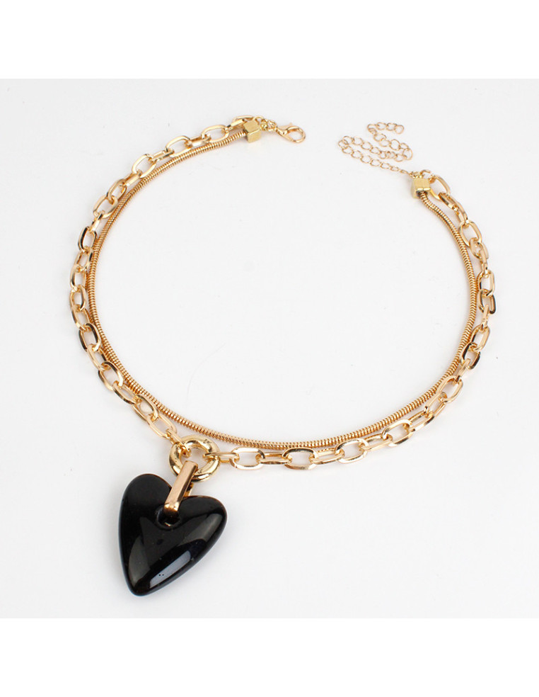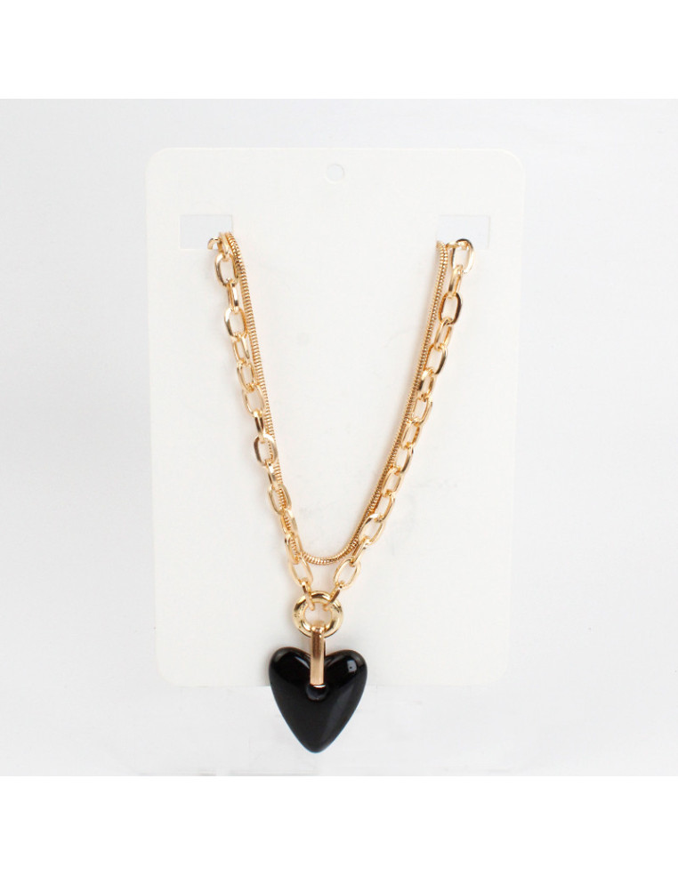 Collar de doble caída de cadenas diferenciadas, intervenidas con dije exclusivo de acrílico con forma de corazón.