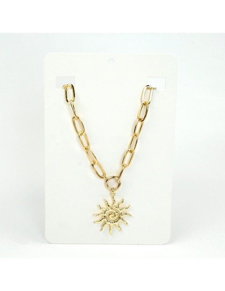 Collar de cadena diferenciada combinada con dije exclusivo de fundición con forma de sol. Medida: 41cm de largo y cierre con mosquetón.