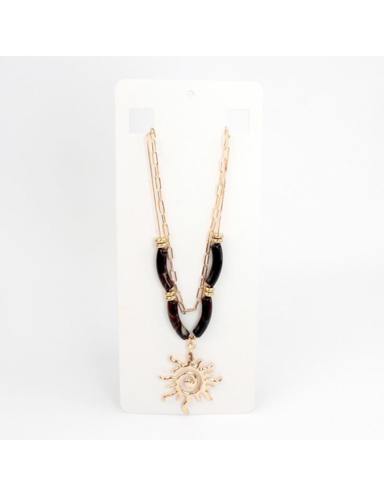 Collar de doble caída de cadenas diferenciadas, una de ellas enhebradas con tubos de acrílico marmolados y dije de fundición con forma de sol.