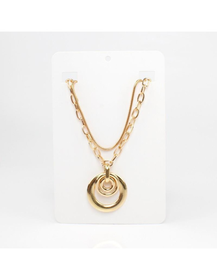 Collar de cadenas doradas, con dijes circulares de CCB. Medidas: 37cm y 39cm de largo, ajustable con cadena de enganche de 10cm.