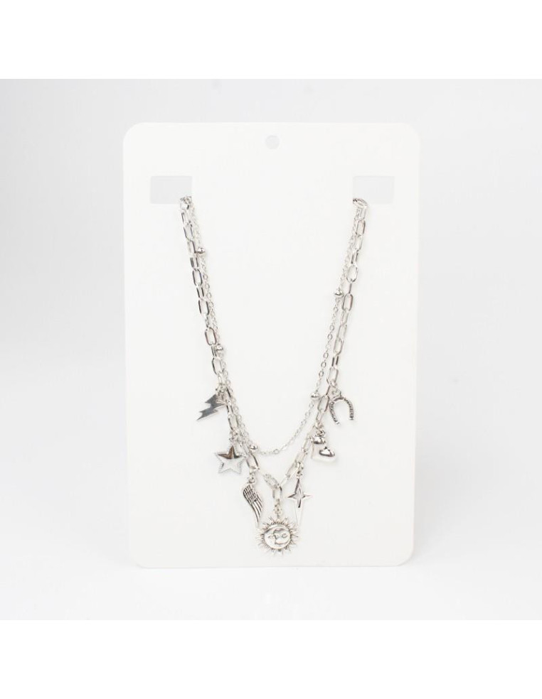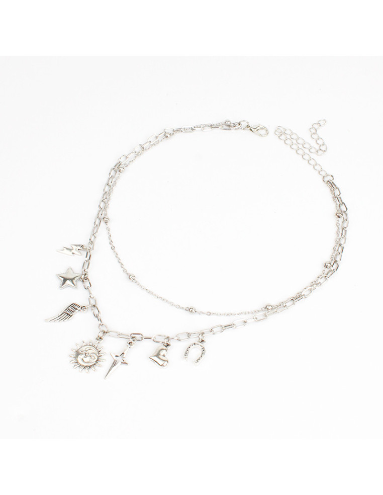 Collar multicharms de cadenas, con dijes de fundición de distintas formas.