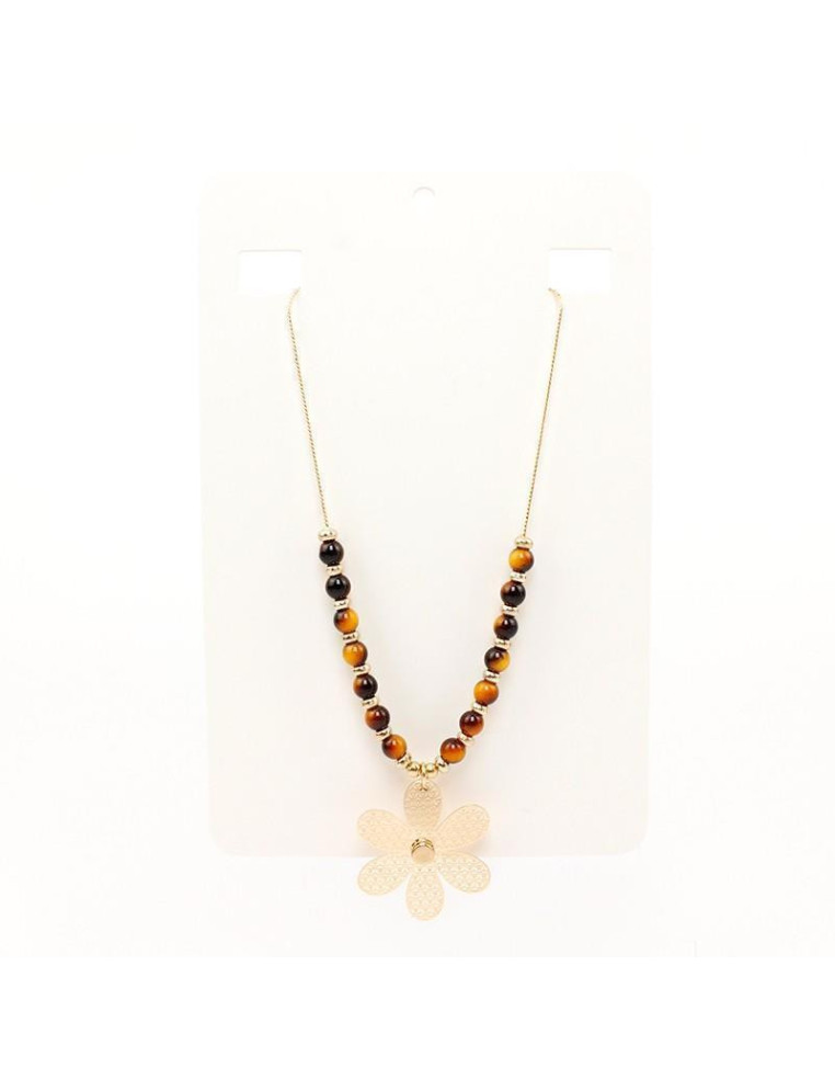 Collar de cadena, con bolitas de vidrio símil ojo de tigre y dije de flor filigrana.