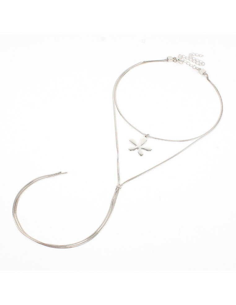 Collar corbatero de cadenas, con dije de fundición con forma de flor. Medida: 37cm y 47cm de largo, ajustable con cadena de enganche de 10cm.