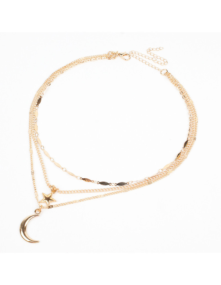 Collar de cadenas con dijes de fundición con forma de luna y estrella doradas.Medidas: 36cm, 38cm y 40cm de largo, ajustable con cadena de enganche de 10cm.