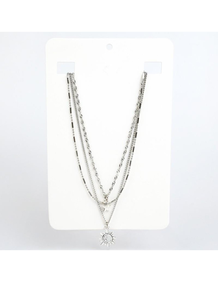 Collar de triple cadenas con dijes de fundición níquel. Medidas: 36cm, 39cm y 41cm de largo, ajustable con cadena de enganche de 10cm.