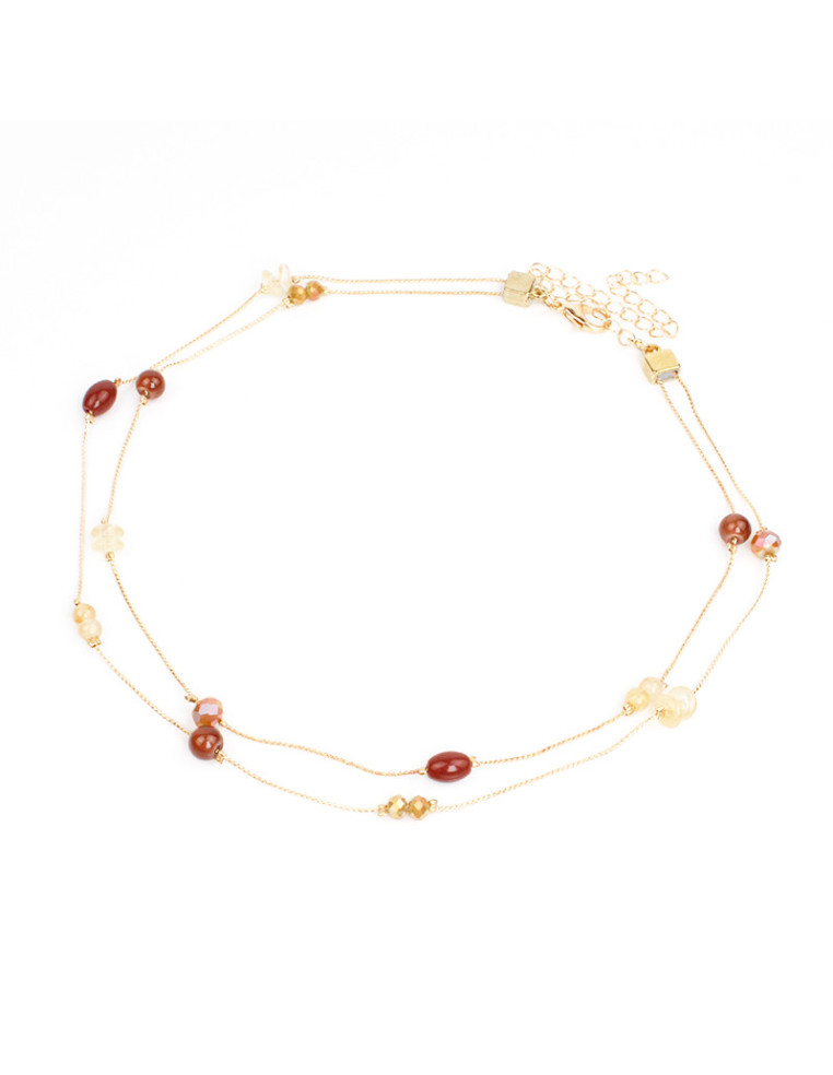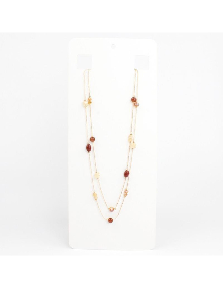 Collar de doble cadenas con bolitas, cuentas de vidrio y roca de cristal.