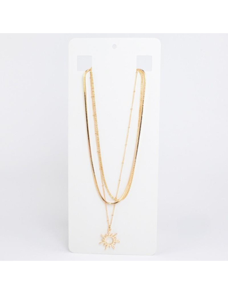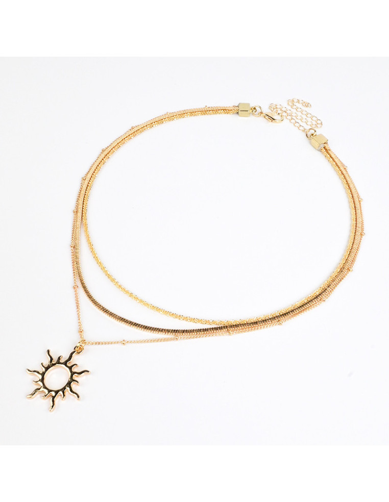 Collar de triple cadenas de diseños con dije de fundición dorado con forma de sol.