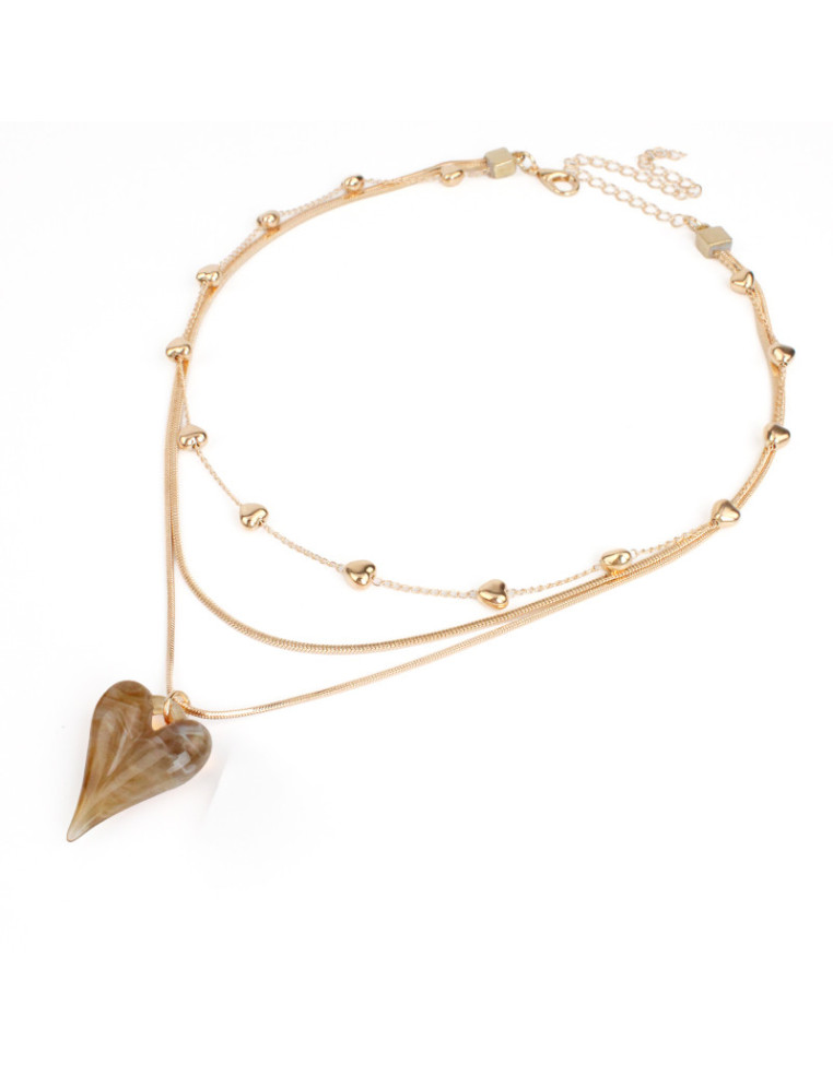Collar de triple cadena, una de ellas de eslabones diferenciados, con dije de acrílico con forma de corazón.
