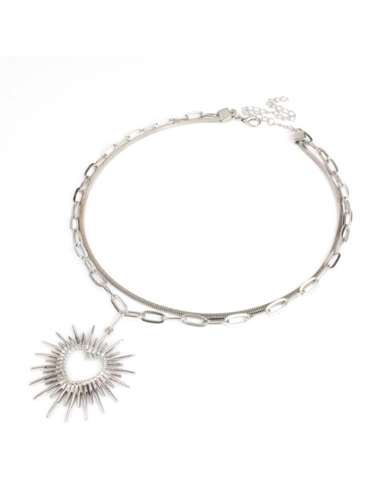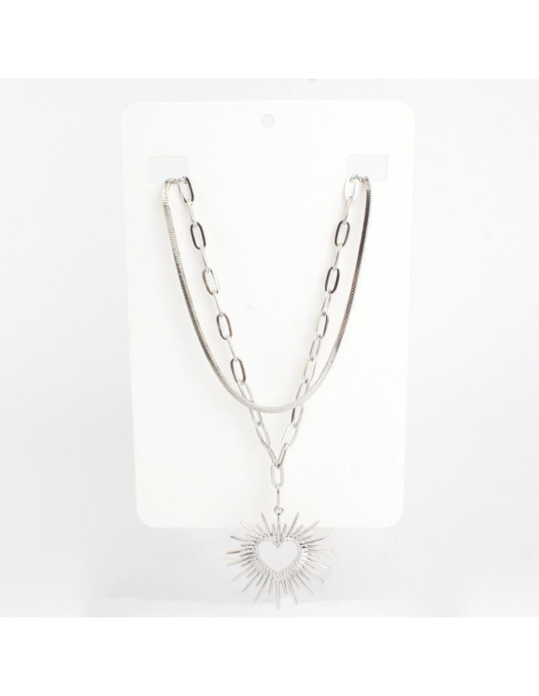 Collar de doble cadenas de diseños distintos, con dije de fundición níquel con forma de corazón. Medidas: 37cm y 39cm de largo, ajustable con cadena de enganche de 10cm.