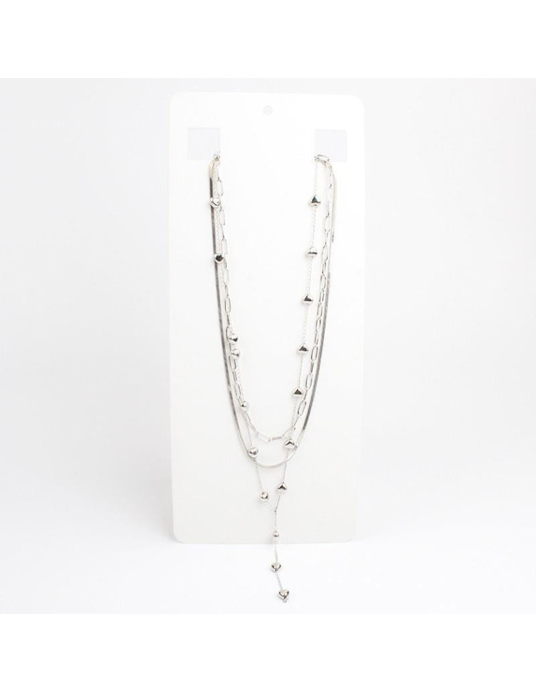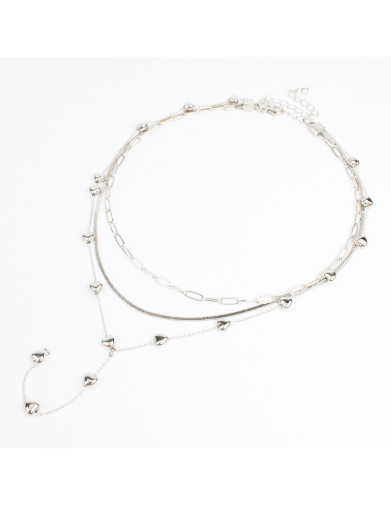 Collar corbatero de triple cadena, con eslabones en forma de corazón y caída de cadena adicional.
