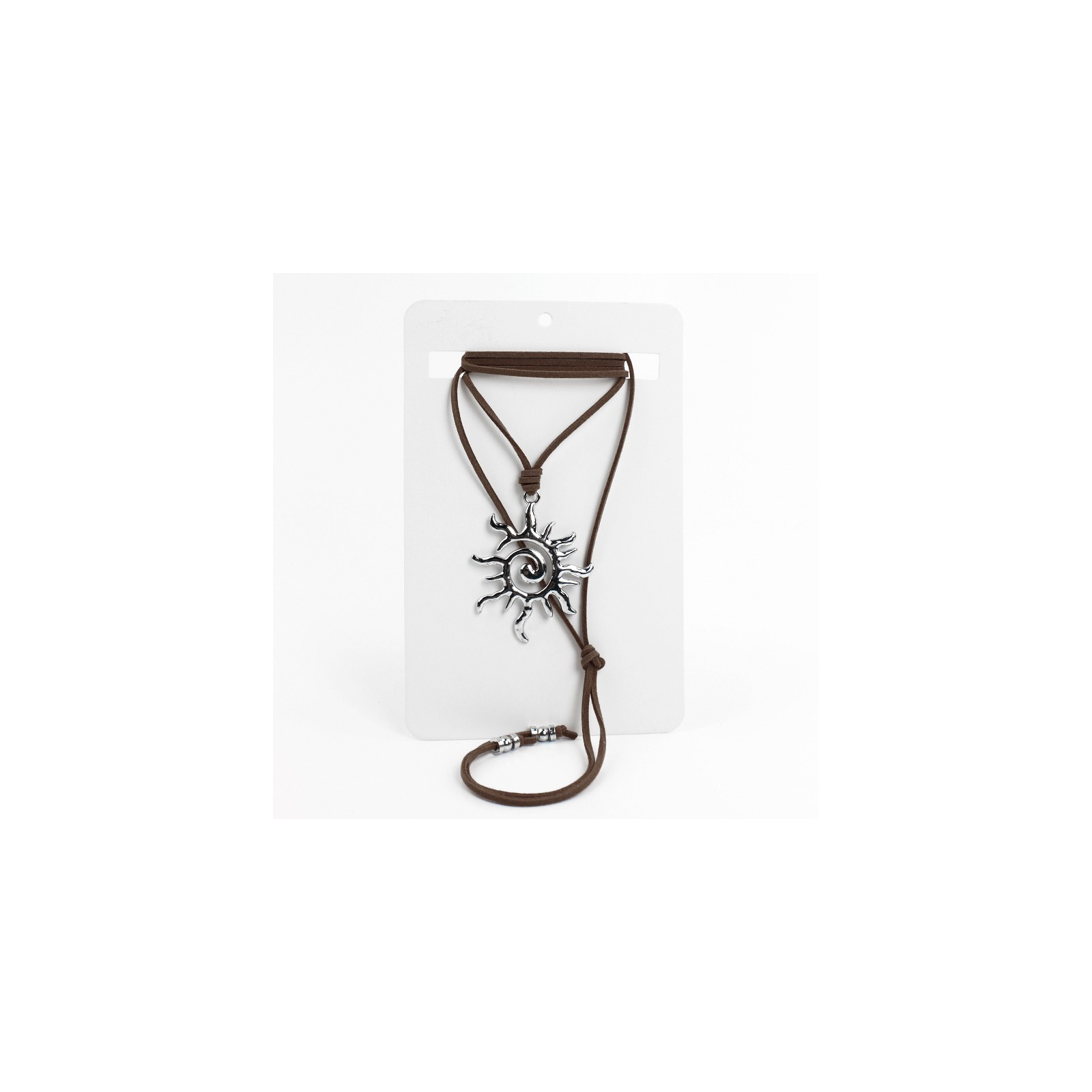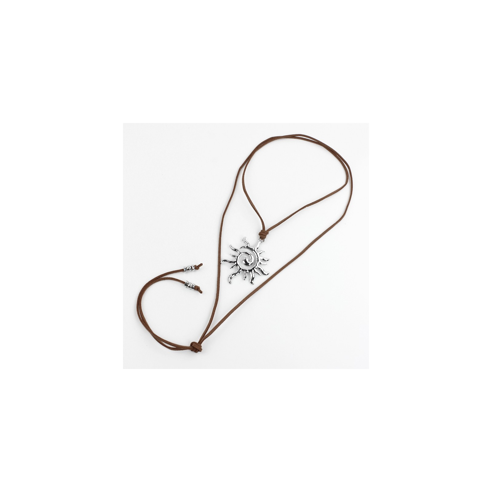 Collar de gamuza de múltiples vueltas, con dije exclusivo de fundición con forma sol playero y terminales en punteras.
