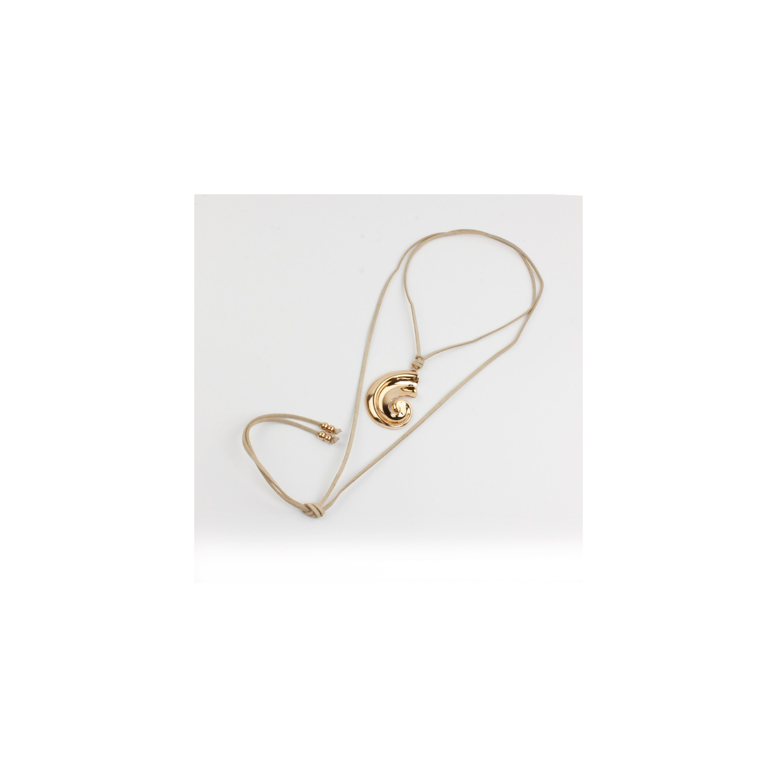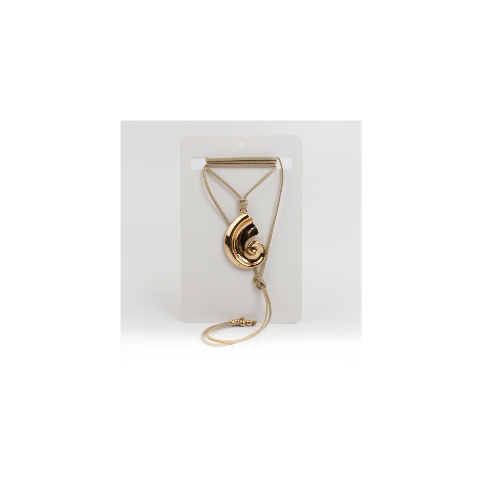 Collar de gamuza de múltiples vueltas, con dije exclusivo de chapa con forma de caracola y terminales en punteras.