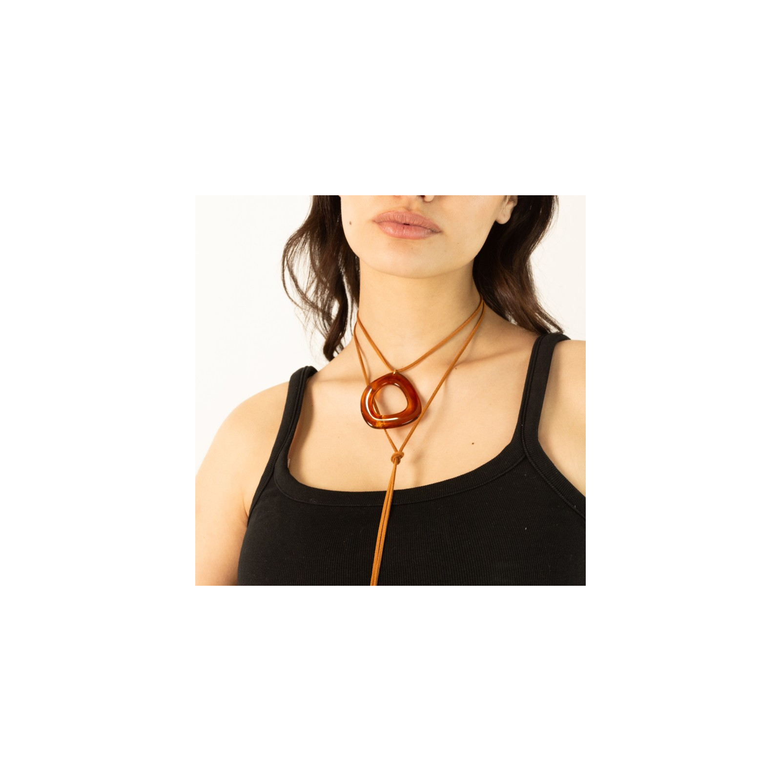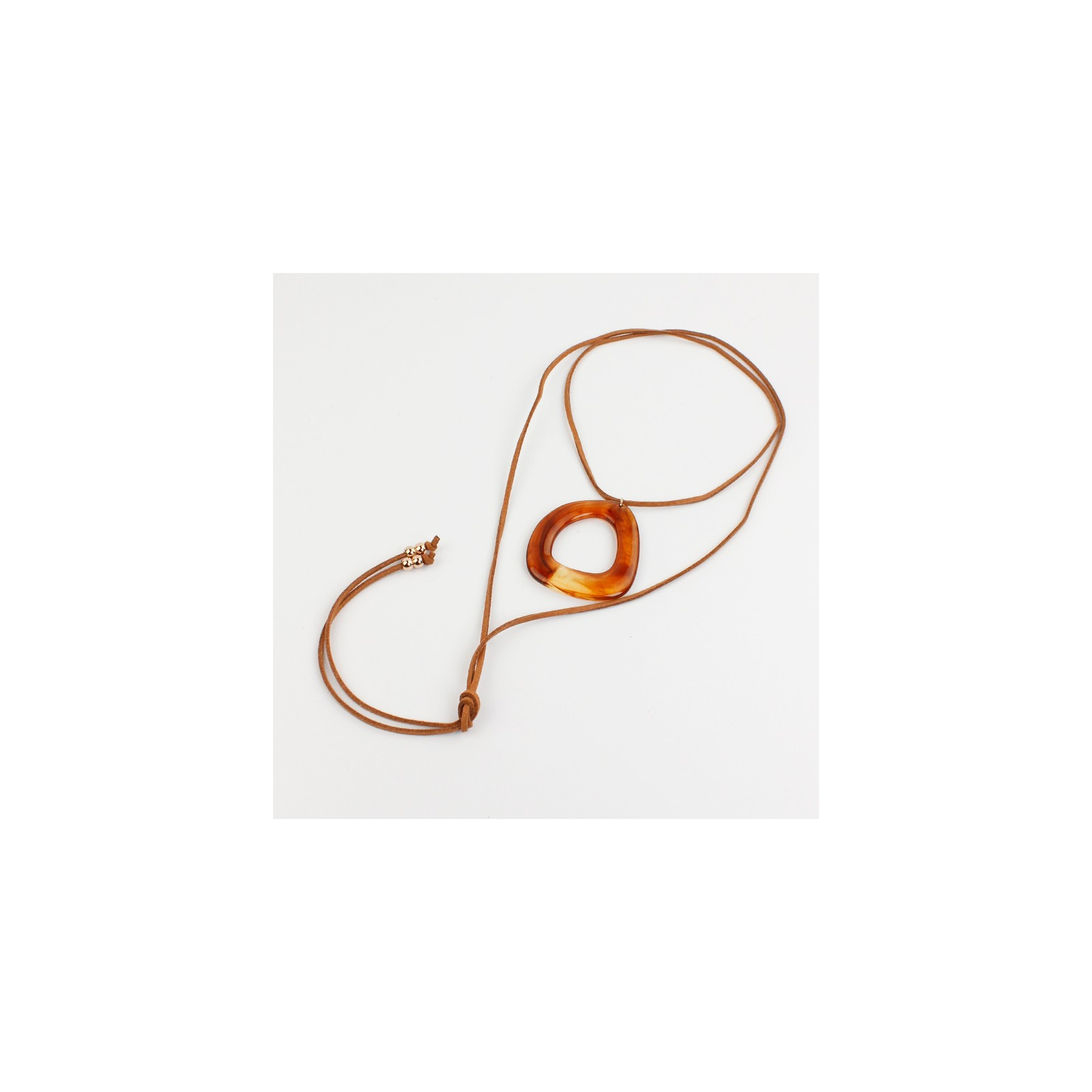 Collar de gamuza de múltiples vueltas, con dije exclusivo de acrílico de forma orgánica y terminales en punteras.